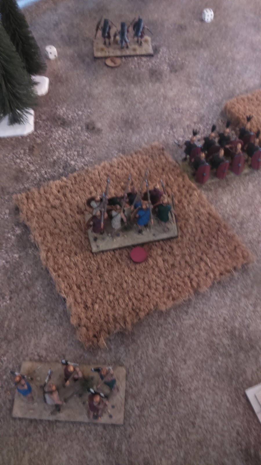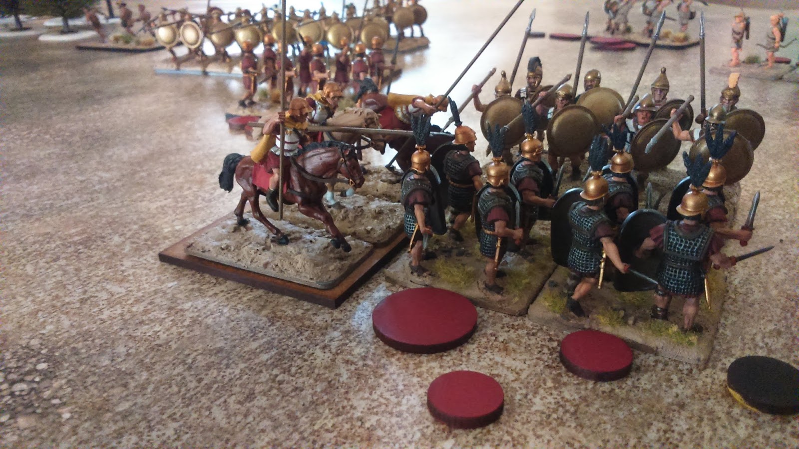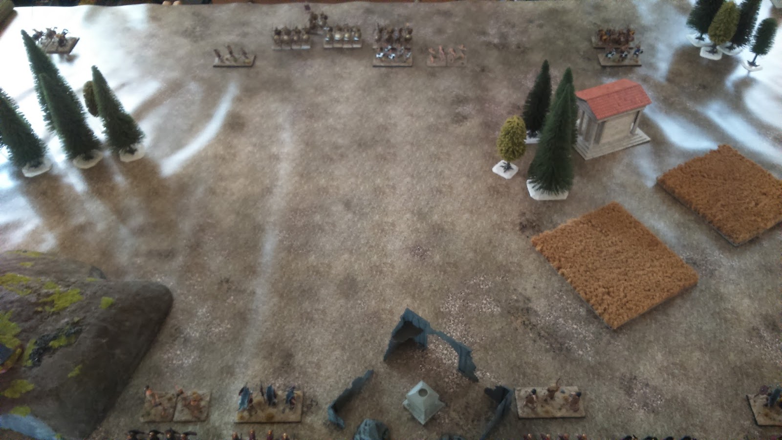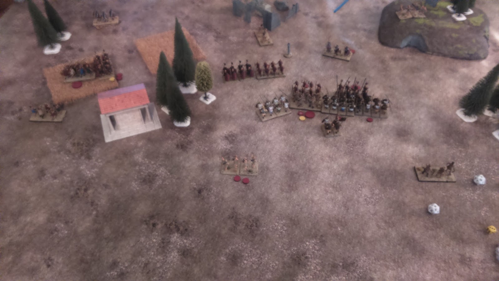 La partida duró algo más de una hora con discusiones de reglas y dudas de por medio pero en general quedamos relativamente satisfechos y nos divertimos, que es de lo que se trataba (Por los dioses, los Hoplitas sin armadura se pasaron casi toda la partida sacando menos de un 3 en todos sus puñeteros chequeos de formación con 1d20!) y en la práctica la mayoría de las unidades han funcionado como en la teoría pensábamos que iban a funcionar. Por supuesto, la batalla esta llena de errores tácticos (si Roma se hubiese hecho fuerte en la colina el resultado posiblemente habría sido otro) pero de lo que aquí tratábamos era de probar las mecánicas del juego y funcionalidades de las distintas unidades. Como punto final decir que se trata de una batalla "mediana" (9 unidades) y que el planteamiento inicial es jugar al menos con el doble de unidades y más oficiales (los flancos se quedan vendidísimos).