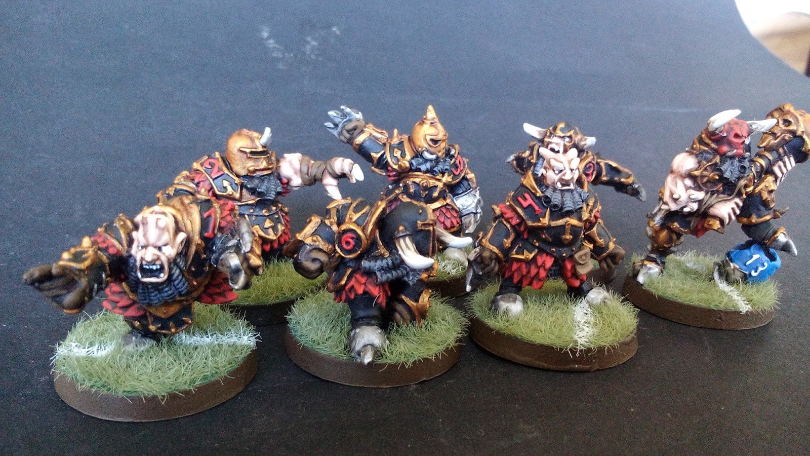 Un trabajo estupendo, me encanta el esquema de color escogido. Yo tengo los míos aún sin pintar, ando liado con el equipo de goblins, a ver si lo termino y empiezo a pintar nuevo equipo. ¿No te entró en el encargo la mini del entrenador ni el minotauro?, esas minis son espectaculares.