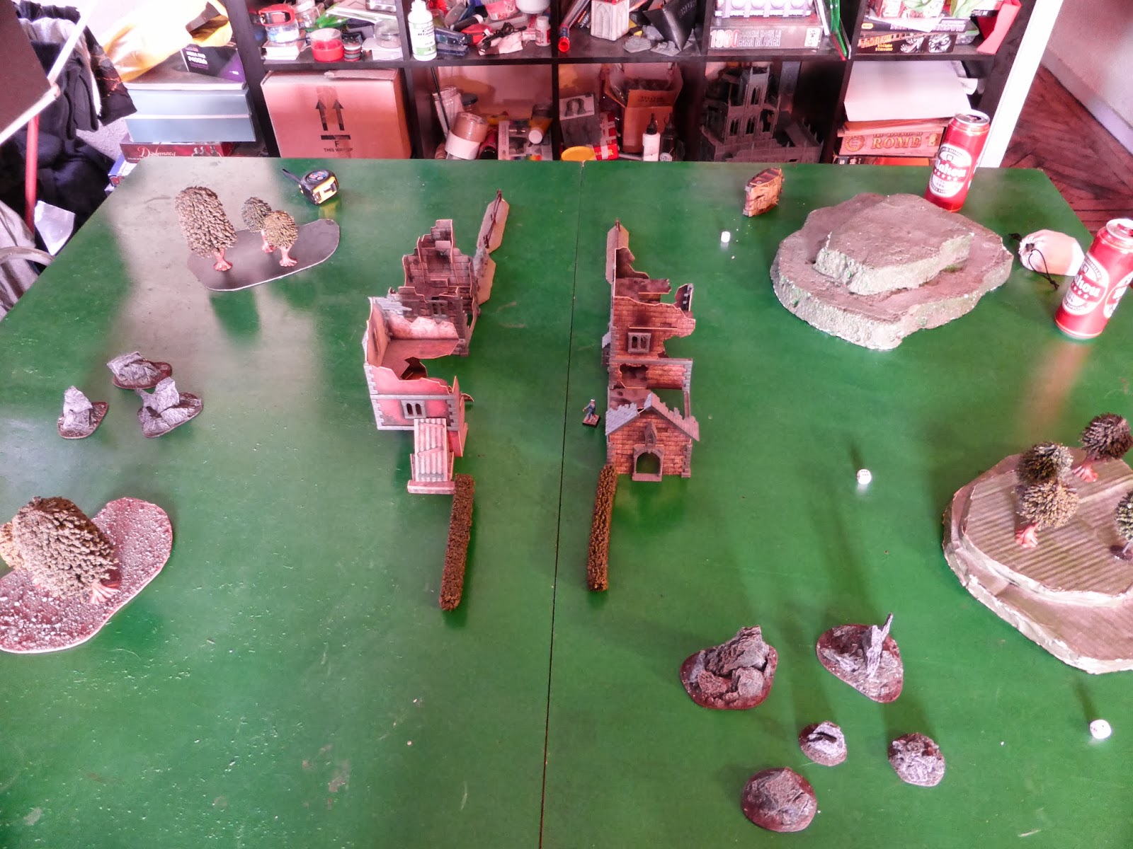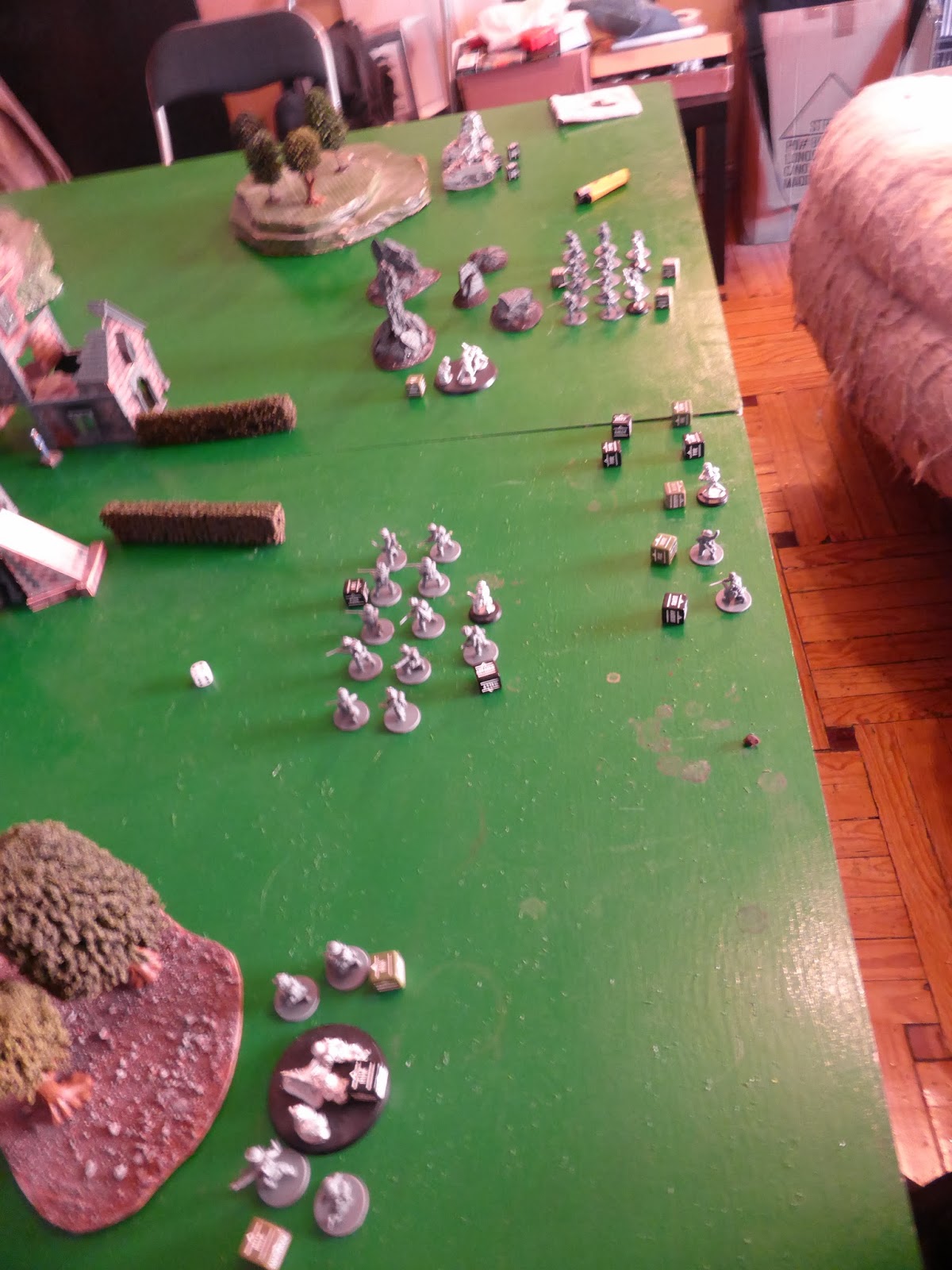 Informe: Este escenario está muy marcado por el hecho de que ninguno de los dos bandos despliega en la mesa, por lo que las tropas comienzan a entrar en el turno 1 como si se tratase de reservas (lo que implica que para entrar deben superar un chequeo de liderazgo con un modificador de -1). Esto, combinado con unas tiradas por ambas partes más bien malas, hizo que buena parte de nuestros efectivos se quedaran fuera de la mesa a la espera de entrar en turnos posteriores.
