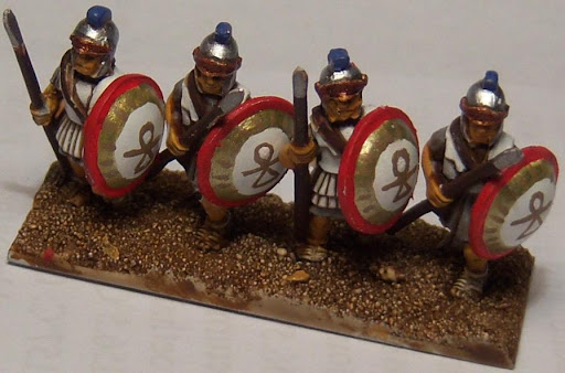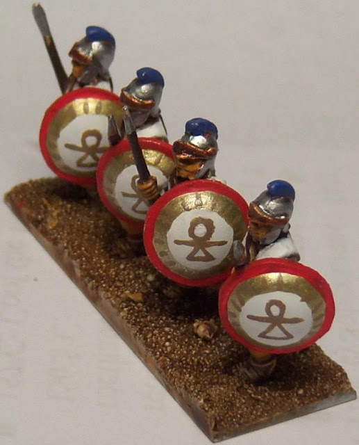 Los lanceros están acabados a falta de los escudos, que en principio usaré los dibujos del 1º post. Me he saltado un poco lo leido por ahí (armaduras metálicas) y para darle sensación de élite y pulcritud he intentado hacerlos lo más limpio posible, de forma que les he puesto linotorax. En cuanto a las túnicas, una plaqueta (la que representa al Batallón Sagrado a pié), van de rojo, otra de gris y otra de lana cruda. De esta forma pretendo diferenciar las unidades o almenos darle importancia a ciertas plaquetas. Los cascos van de plateado y las "viseras" de bronce. Otra licencia "artística" (si se puede llamar así a como mancho las miniaturas), es que les he pintado los penachos de los cascos de azul, de forma que todas las plaquetas del ejercito lleven algún detalle de azul y poder darle algo de uniformidad a un ejercito de mercenarios.