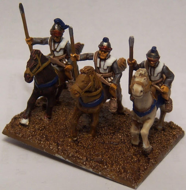 Por ahora junto con las caballerías ligeras es lo que he avanzado; este fin de semana pretendo acabar los jinetes y los lanceros de los elefantes. Para ver las 2 últimas fotos algo más grande, buscar por aquí
