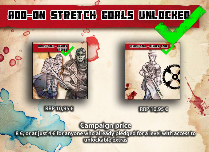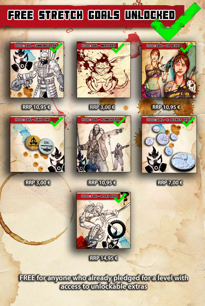 La campaña de Punkapocalyptic sigue a buen ritmo. Hemos superado la barrera de los 19.000 €, que es más del 200% de la meta inicial, y desbloqueado una buena cantidad de stretch goals. Aquellos backers con una contribución con derecho a extras ya tienen material gratis por valor de más de 50€... y lo que aún está por llegar.  Y además, la opción de hacerse con las dos miniaturas que se han desbloqueado como add-on a solo 4 € cada una para los backers con acceso extras.