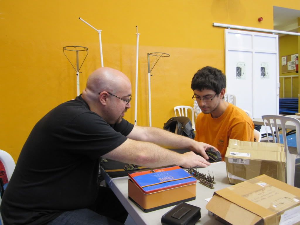 En el torneo eramos pocos (5) por bajas de ultima hora (8, creo) asi que decidimos hacer una pachanga: 3 partidas y por la tarde montarnos una batalla grande. AL ser 6, en cada ronda uno jugaba DOS partidas a un tiempo. Les tocó hacerlo a makarren y a redentor en las 2 primeras rondas. La hora de comer COJONUDISIMA como de costumbre en los torneos, lo mejor.  :1st