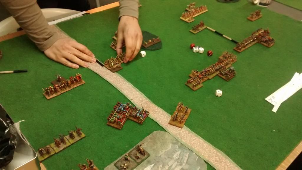 mi ala derecha consiguió derrotar por completo a sus oponentes y consiguió distraer algunas unidades de su centro que tenían vía libre para enfilar directo a mi bagaje, tras romper a mi infantería pesada y aprovechar un hueco en el despliegue.