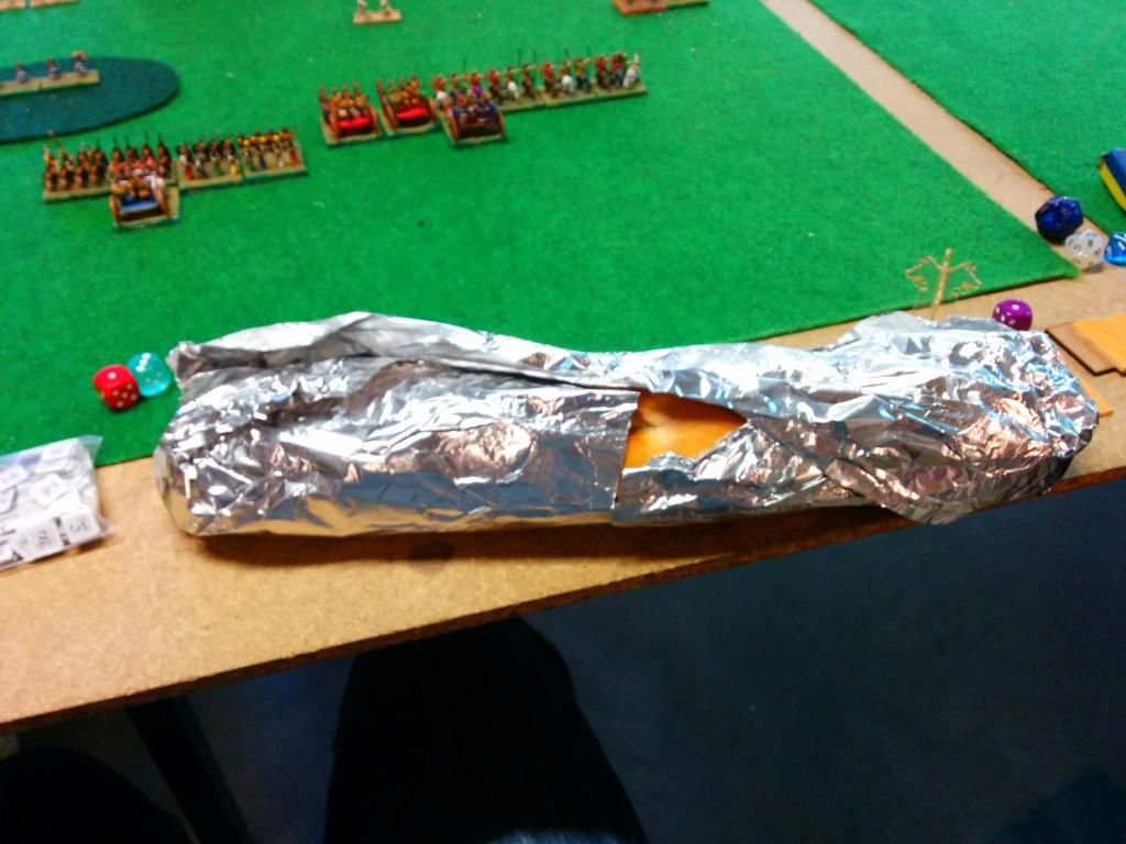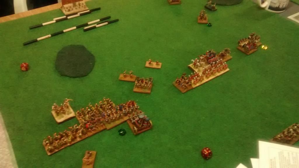 en el centro de la mesa había un terreno accidentado que en cierto modo impidió que todas el mando central, a base de infanterías pesadas en ambos casos, se enfrentara.