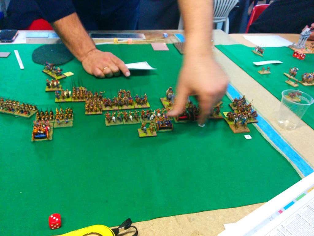 L segunda fue contra Raul Martínez de Zaragoza. Me sorprendió el uso de una emboscada que desplego pero mucho mas su contenido, consistente en 2 unidades de jabalineros. en su flanco derecho tenia 2 elefantes protegidos por 4 lanceros MI y LI arqueros además de los jabalineros. Era un Mando fuerte  y en mi opinión muy bien estructurado, y sobretodo muy bien desplegado. Mi mando III estaba en clara desventaja tanto en calidad como en cantidad de tropas.