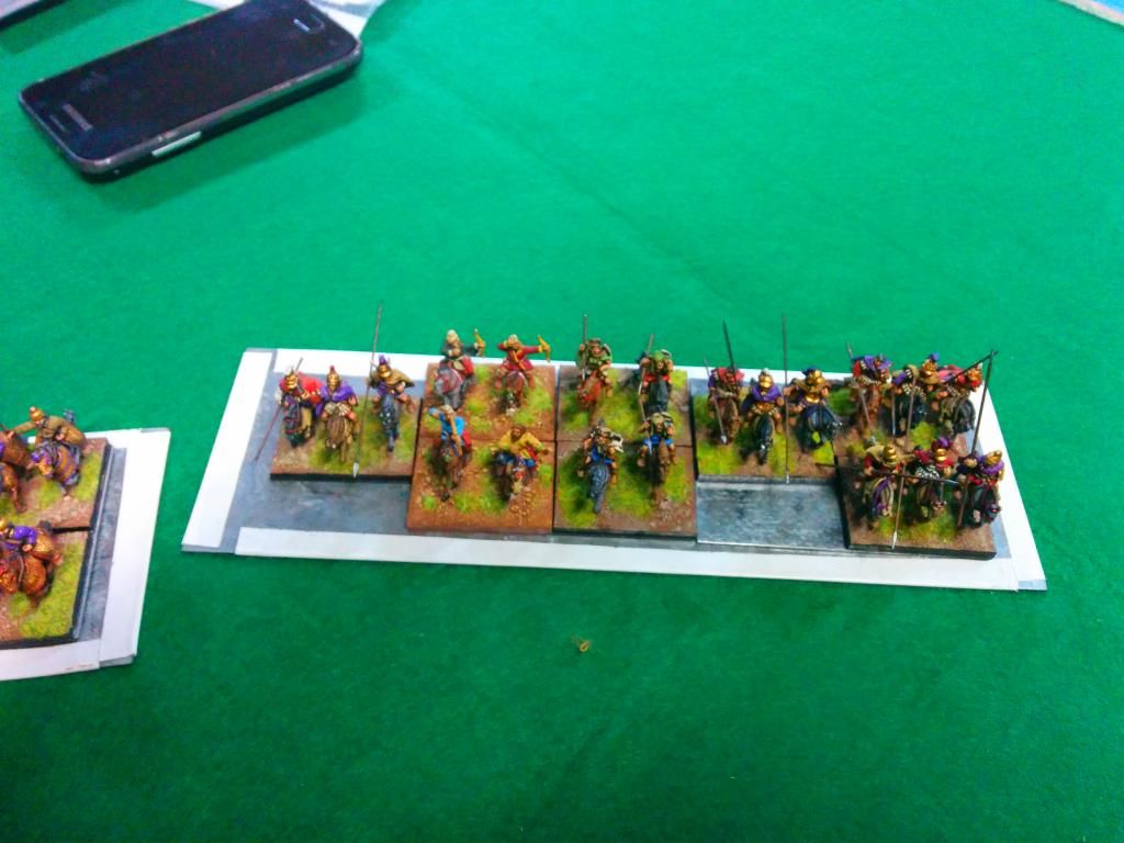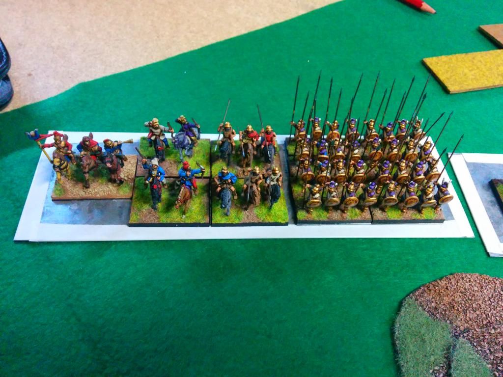 La primera fue con Miguel Engelmo, el anfitrión, que llevaba un Alejandrino macedonio con también 24 elementos. como ha c0omentado mi caballería superaba a la suya en numero lo que supuso una perdia de ese flanco. las tropas ligeras y los jabalineros se portaron bien  consiguieron destruir una unidad de elefantes. en la infantería hubo un toma y daca. Al final la partida se decidió en las alas. tuve 5 bajas y 6 unidades tocadas.