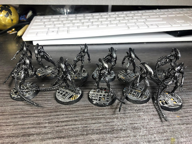 Pintar Aliens no tiene mucho misterio. Spray negro, perfilado de metalizado y un baño generoso de Nuln Oil brillante:
