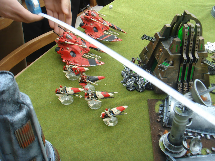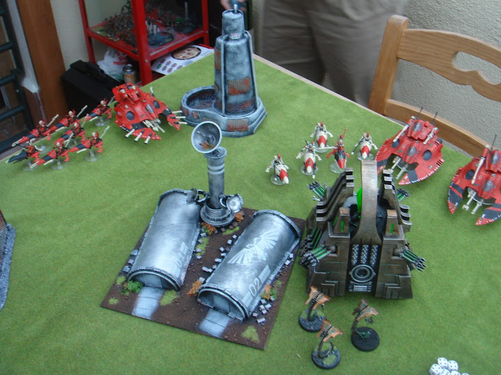 La fase de disparo fue irregular, las lanzas del Vidente y el Brujo en moto impactaron al Dread, pero solo pudieron aturdirle (otros dos impactos de F9 que se comía...), lo Dragones hicieron su trabajo haciendo explotar al Land Raider, matando a dos escoltas del Señor en el proceso. La vyper no pudo hacer superficiales al  segundo Dread, y en la fase de asalto las motos retrocedían evitando en lo posible al acobardado Dread con cañón de plasma.