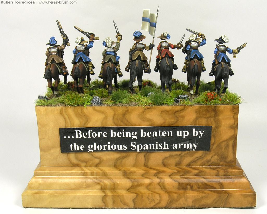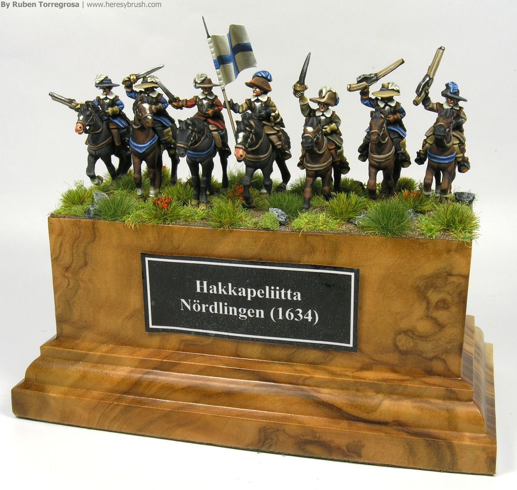 Documentandome para pintar mi ejército sueco encontré algunos grabados de la época(Parece ser que de alguna fuente imperial católica) en los que se representa a los Hakkapeliita con pinta de cosacos desmadrados, peludos, con gorros altos de piel,espadas curvas y saqueando conventos. Ya sabeis, la neura alemana de que vienen los eslavos. No creo que se le pueda atribuir mucha fiabilidad, pero explica el que en algunas referencias los representen con pinta de eslavos.Lo que sí he visto en varias fuentes es que en la época el color regimental de, al menos algunas unidades, era el naranja.