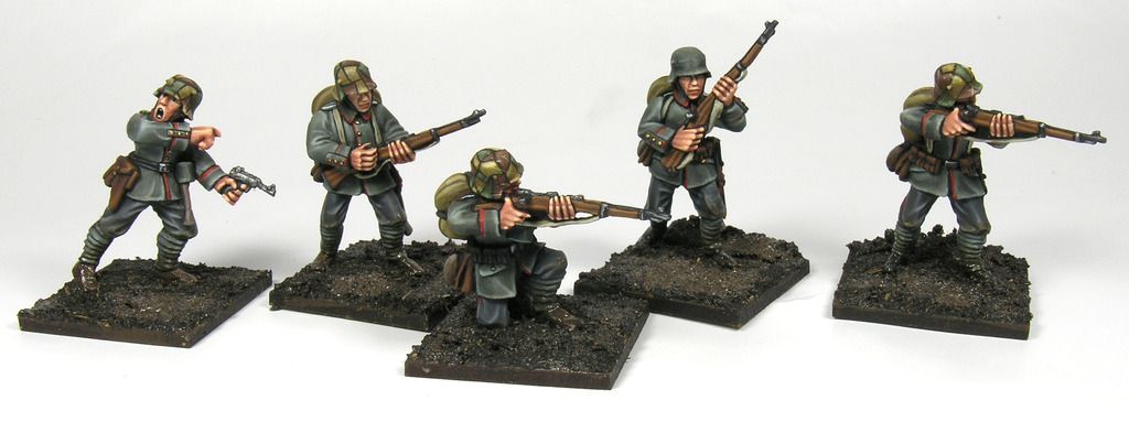 Muy buenos esos alemanes, incluido el camuflaje de los cascos, muy logrado. Los has montado en peanas de quita y pon? Si es asi, estan totalmente mimetizados...