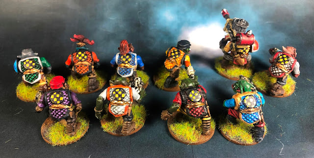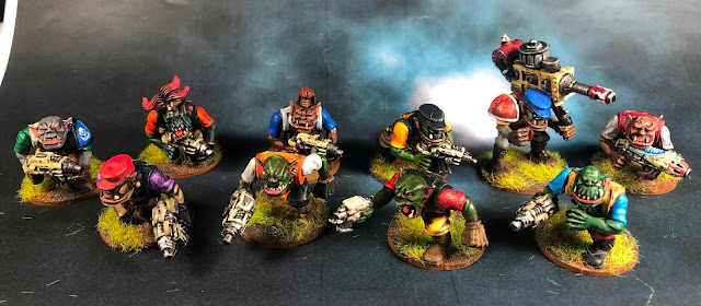 He roto con la idea de los Clanes, los he hecho rogue trader primigenios, de antes de que GW inventase los clanes. Me apetecía mucho hacer esta explosión de color, nada de diez fulanos clónicos. Y de hecho rompo también con el paradigma de la piel verde de un mismo tono.