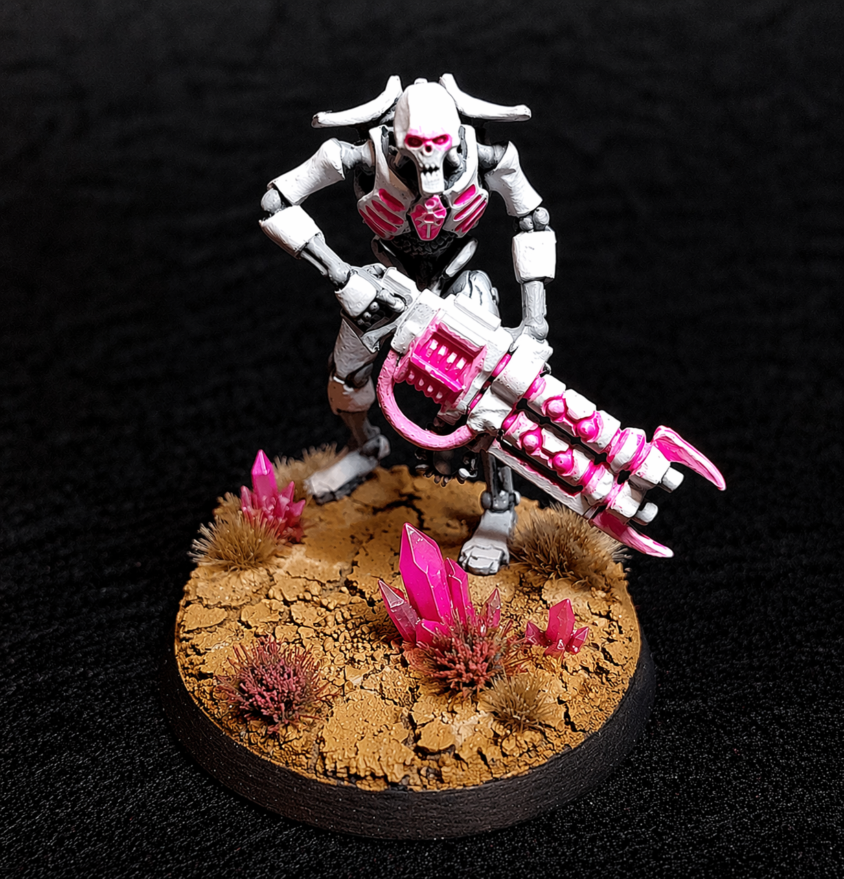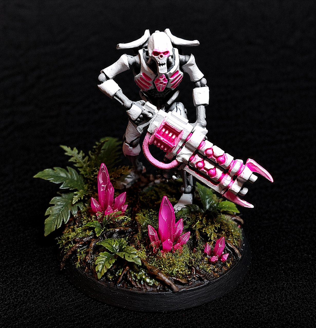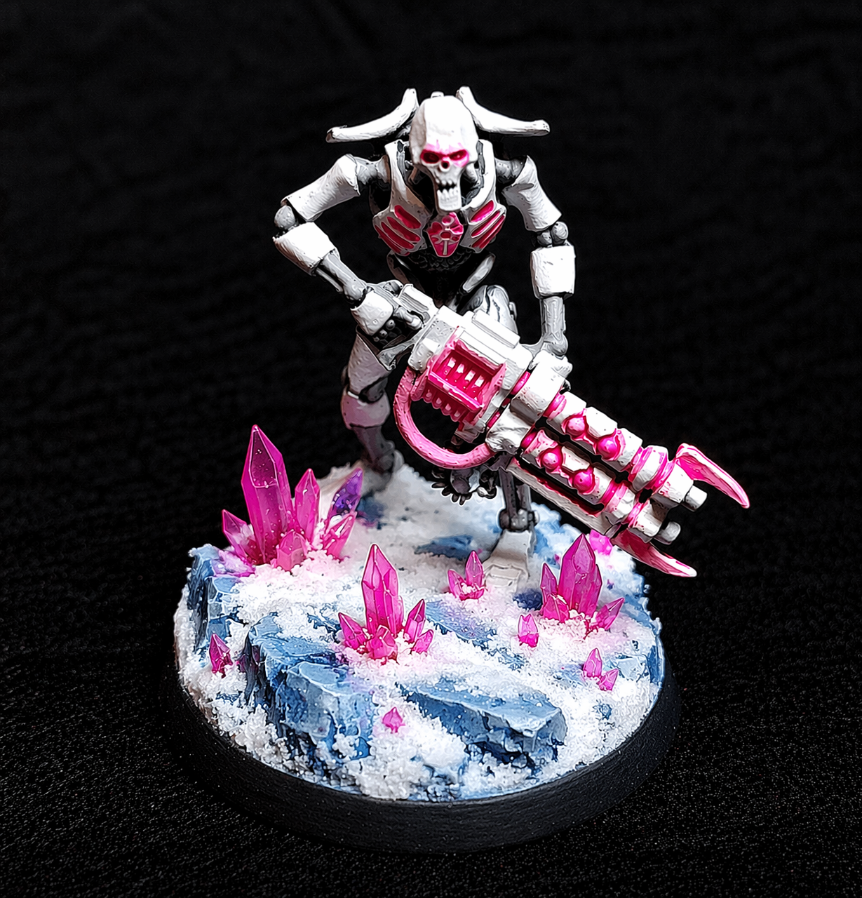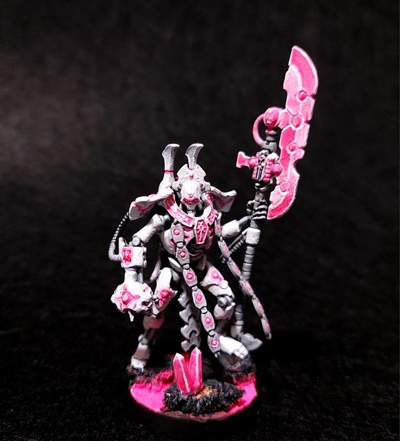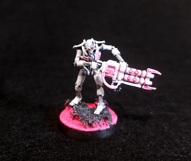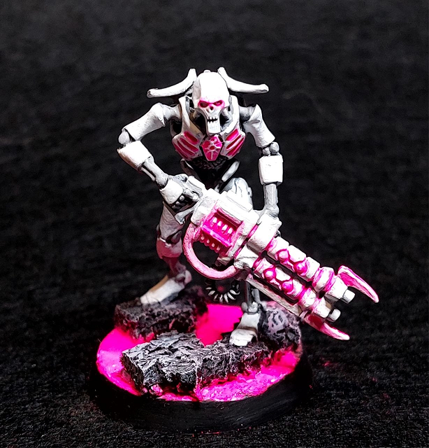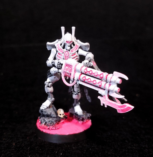 Blanco iba a ser el color principal, con grises para las partes internas. Las luces, armas y visores históricamente verdes pasarían a ser rosa neón. Así que empecé a pintar las primeras minis con este esquema y me encantó. Aquí os muestro el resultado.