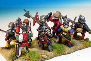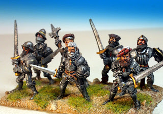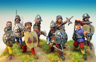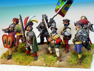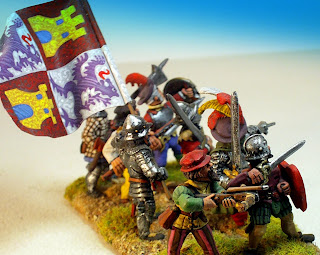 Muchas de las cabezas son del Imperio, unas tal y como veían en las cajas y otras transformadas. Como dice el compañero, me encantan hacer barbudos con masilla, modestia aparte lo tengo bastante dominado porque he hecho cientos. Otras son las cabezas originales de las figuras, tal como vienen o con ciertas transformaciones también. Y otras, en este caso concreto de los rodeleros muchas, provienen de los Conquistadores de Foundry. Como ya he comentado en otras ocasiones, a esas cabezas las tengo un especial cariño porque en cierto sentido son "mÍas". Cuando Copplestone se disponía a modelar las figuras de los Conquistadores para Foundry, me escribió una carta pidiéndome información sobre la época, por un artículo que yo escribí hace tiempo para el diario "Arquebusier", de la "Pike and shot society". Así que la mayoría de las figuras que modeló Copplestone las hizo basándose en la documentación que le suministré. Creo que fue la primera vez que se hicieron unas figuras de Conquistadores para 28mm basándose en documentación real y no en las elucubraciones decimonónicas que aun circulan por ahí. Por eso, desde que salieron me hice con decenas de Conquistadores de Foundry para hacer transformaciones. Por cierto, que la misma documentación se la pasé posteriormente a Old Glory, cuando sacó sus Guerras de Italia y a The Assault Group cuando sacó sus propios Conquistadores. Alguna de las cabezas utilizadas son de esta última marca si no recuerdo mal.