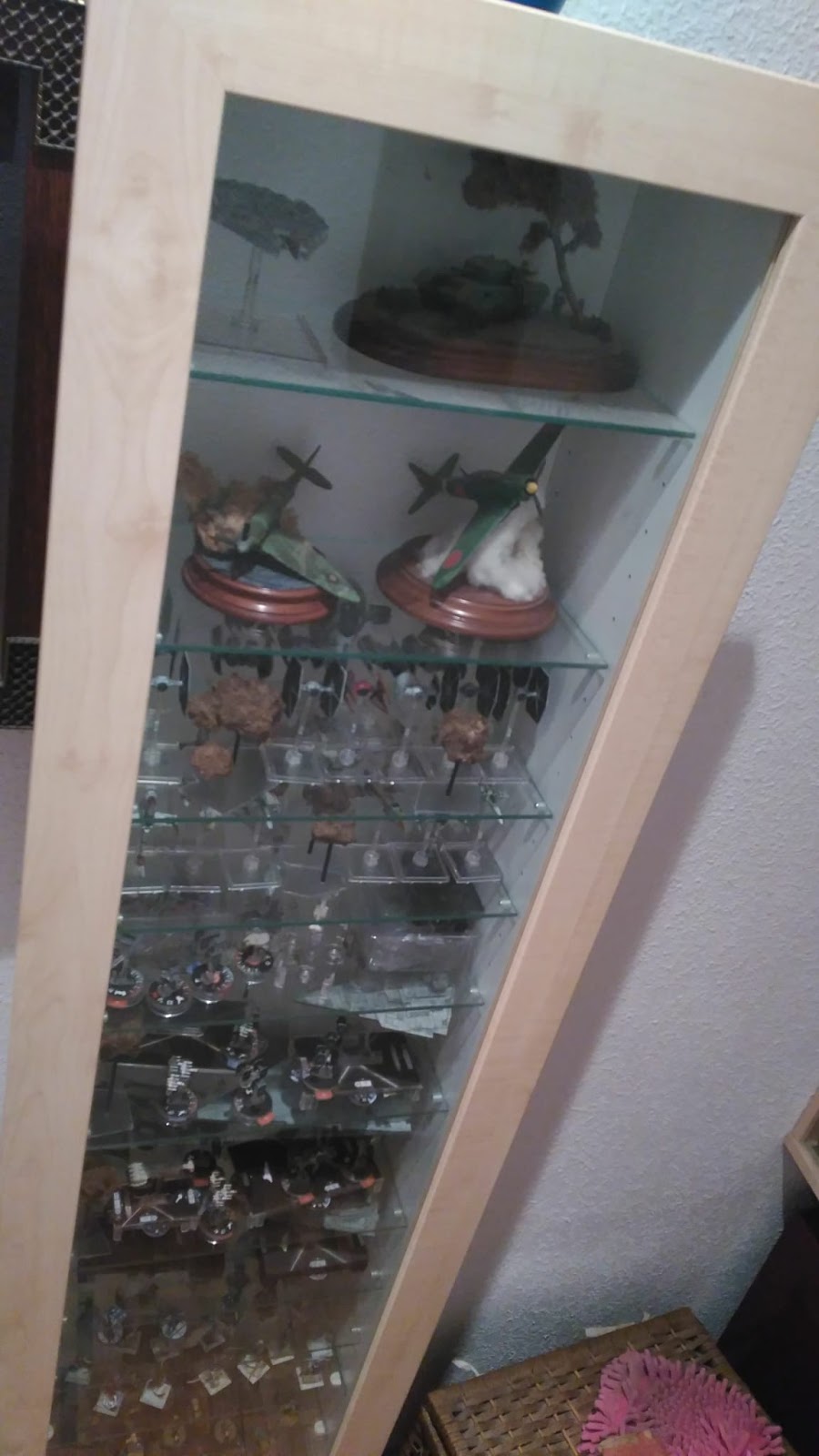 Además puedes optar a pillarlas con la parte de atras tipo espejo y asi ver la espalda de las miniaturas... adjunto una foto pero por el espejo es muy dificil pillarla bien. El modelo que yo tengo es bastante pequeño, con 3x3 estantes para miniaturas individuales, pero puedes pillarlo en otras combinaciones para que quepan los ejércitos en cada balda.