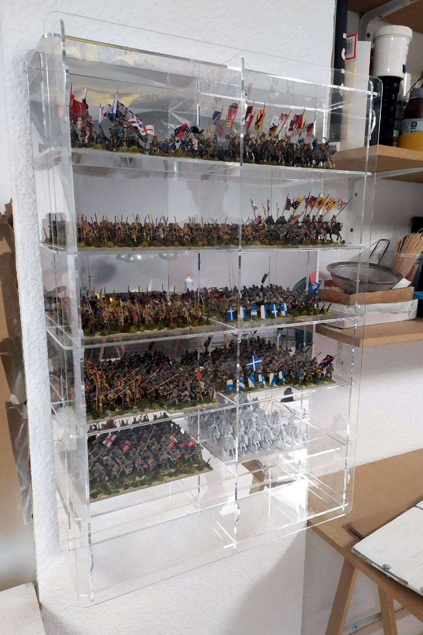 Yo tengo una urna de metacrilato, pero es un jaleo cada vez que tengo que sacar el ejercito porque no tiene una puerta (actualmente tengo metidos los Altos Elfos de Warhammer que ya apenas uso).