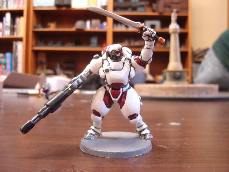 Quiero seguir más o menos el esquema blanco de los japoneses de Infinity, y acabo de ver esta miniatura que me ha gustado mucho. ¿Qué os parece eso de pintarlo con spray y barnizar?