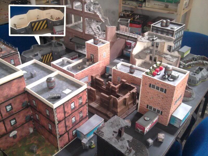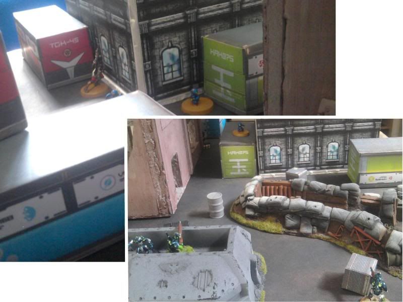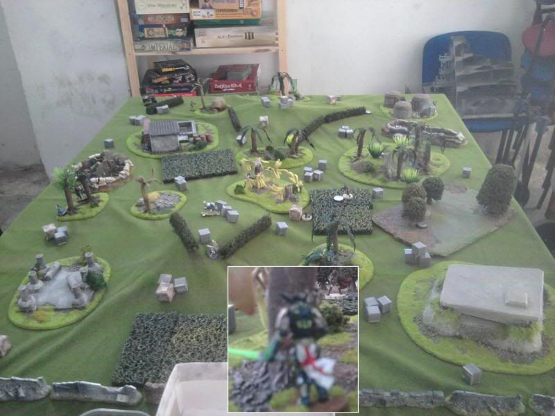 Respecto a la escenografía de esta partida en concreto... Resulta que las cajas que hemos diseminado por todo el campo de batalla, reprentan piedras hasta que nos pongamos una tarde a hacernos media tonelada de piedritas de corcho. Así tendremos las cajitas para tirarlas (literalmente, las tiramos sobre el campo de batalla y que den cobertura donde diox quiera) en escenarios urbanos y las piedricitas para lanzarlas sobre escenarios salvajes.