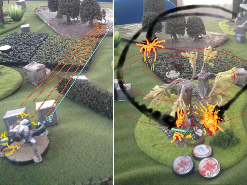 [`Turno 2 Acontecimiento:]Jorge, el montesa, empezó a lanzar granada tras granada contra el paraca nómada. El pobre hellcat disparaba pegamento al caballero. Y el paraca sobrevivía y sobrevivía en una ocasión incluso alcanzó al montesa quién logró no quedar inmovilizado. Disparó y volvió a lanzar más granadas y más disparos, y el jodido paraca terminó sucumbiendo. El montesa sonrió (la cantidad de órdenes que gasté ahí). Y Bagheera, el bagh-mari estandar, recibió órdenes de cambiar su posición y acercarse al centro para dar apoyo al montesa, para evitar posibles maniobras futuras de los nómadas, ya que  aquel lado sólo quedaba amenazado por el moran llorón, y el palbot médico que ya no podía ayudar al montesa, se fue detrás.