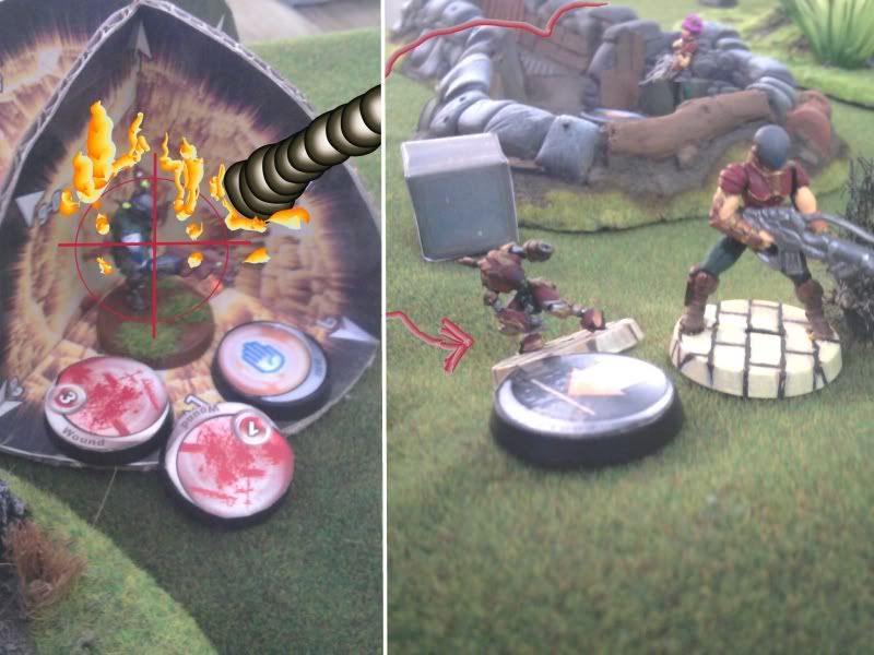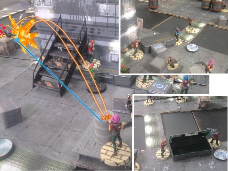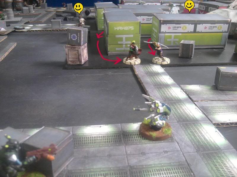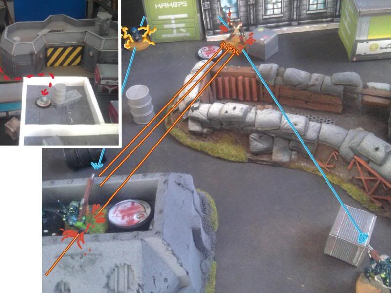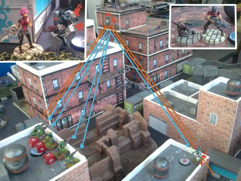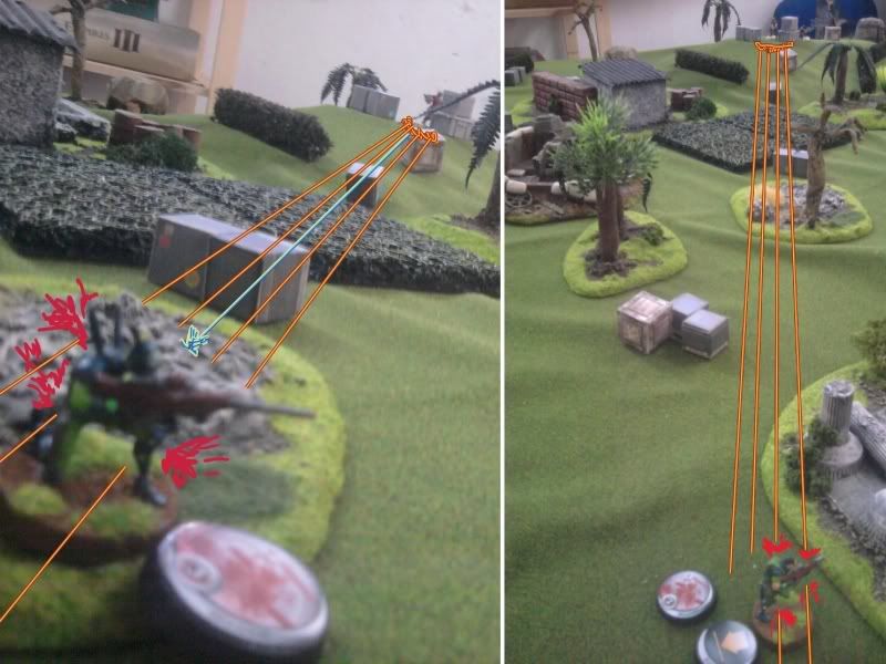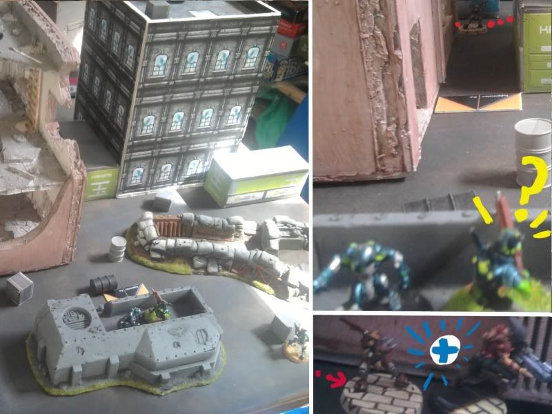 Un tipo de esos invisibles, infiltrado, con escopeta cargada con por el diablo, se carga al sierra -que decidió esperar- y al remoto -que trata de descubrir- del otro Guarda de Assalto con MULTI (es el orco, pero es que no tengo otra figura de GdA).