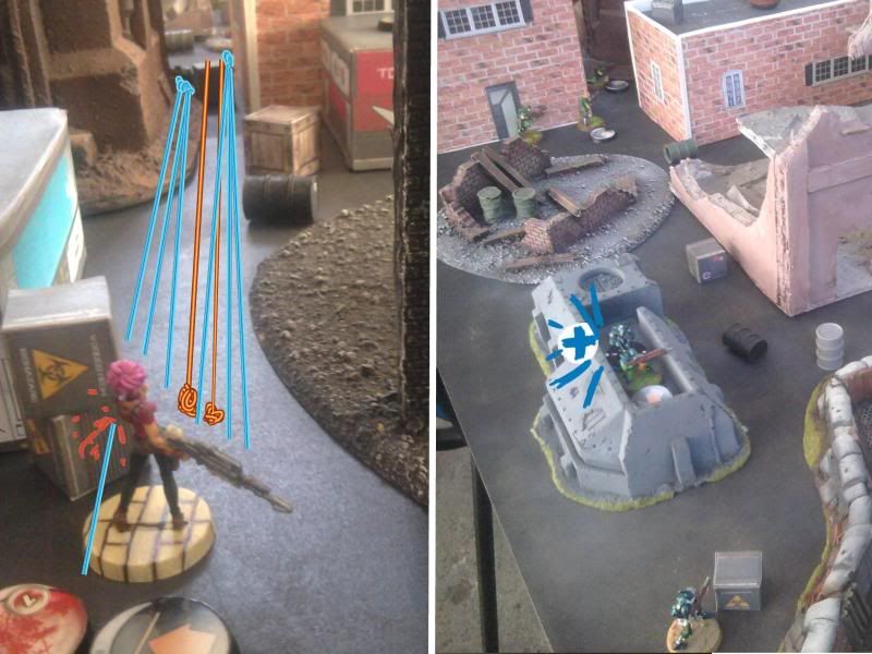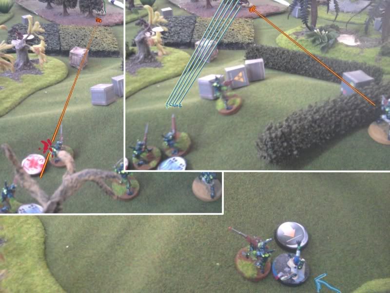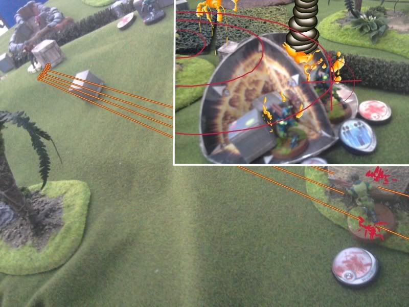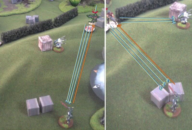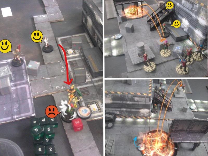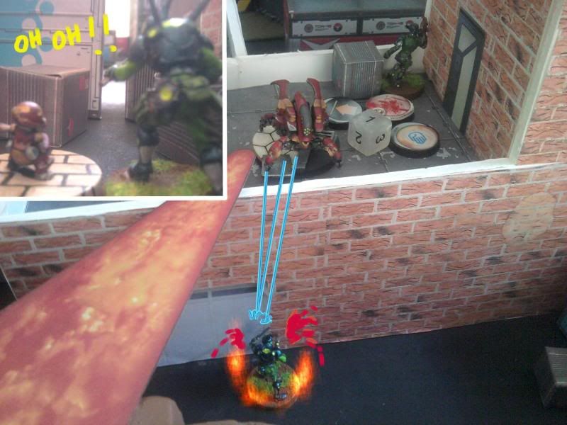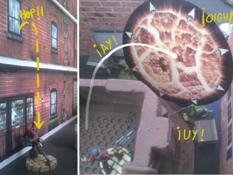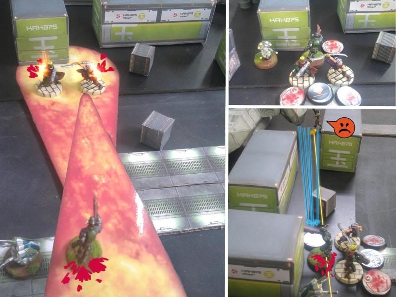 Un tipo de esos invisibles, infiltrado, con escopeta cargada con por el diablo, se carga al sierra -que decidió esperar- y al remoto -que trata de descubrir- del otro Guarda de Assalto con MULTI (es el orco, pero es que no tengo otra figura de GdA).