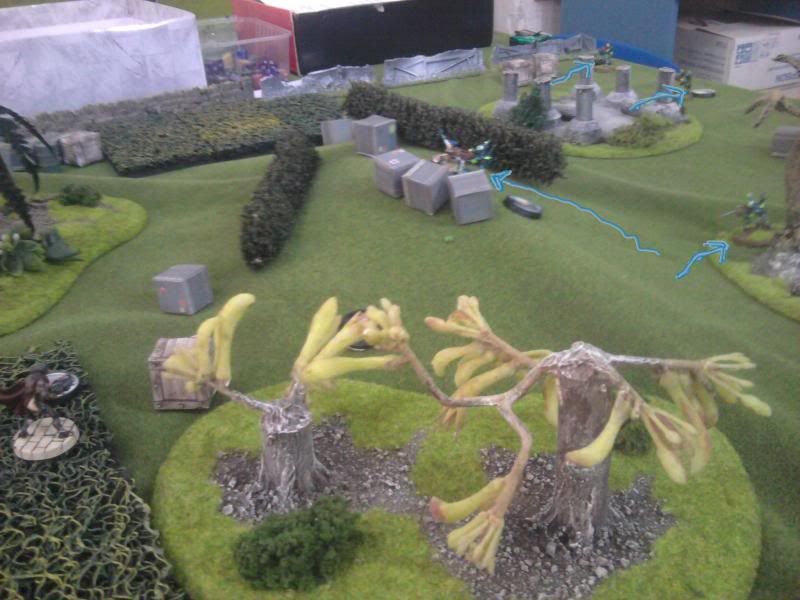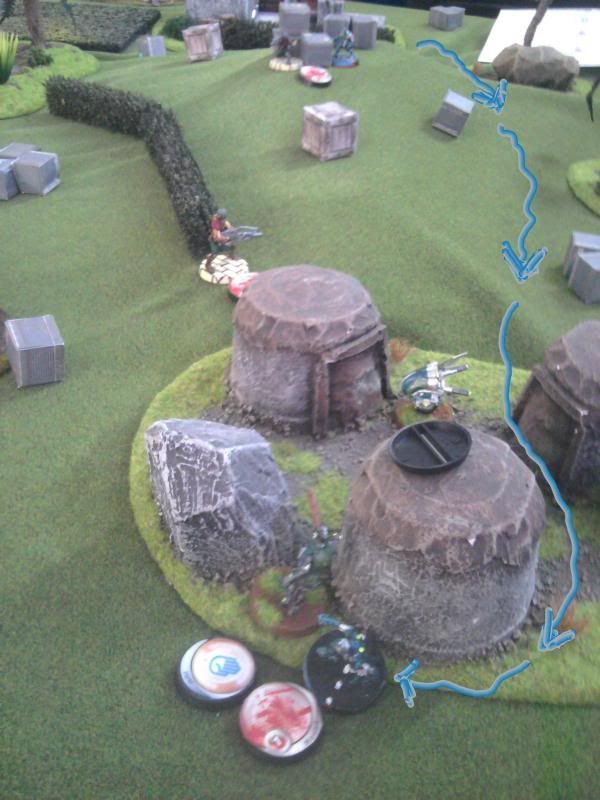 que una vez allí, se arrepienten de haber ido. El bunquer es la estructura que se ve abajo a la derecha. Un caballero de montesa con lanzagranadas desembarca en el medio del campo de batalla "desde aquí lo voy a controlar todo" y un peacemaker baja a su lado, el vehículo de transporte se aleja mientras el piloto les desea buena suerta. Detrás de unas hojas aparece un cazador masai, que estaba cultivando algo parecido a la marihuana. El moran ve al caballero y el caballero ve al moran (a título narrativo, en verdad no se vieron). La selva está a punto de E-X-P-L-O-T-A-R. [El nómada sacó mejor tirada y eligió mover primero así que yo le mandé desplegar primero. Se guardó al moran para desplegarlo después que yo, así que lo puso delante del montesa. Yo había reservado al Guardia de assalto que lo coloqué en mi flanco iqdo]