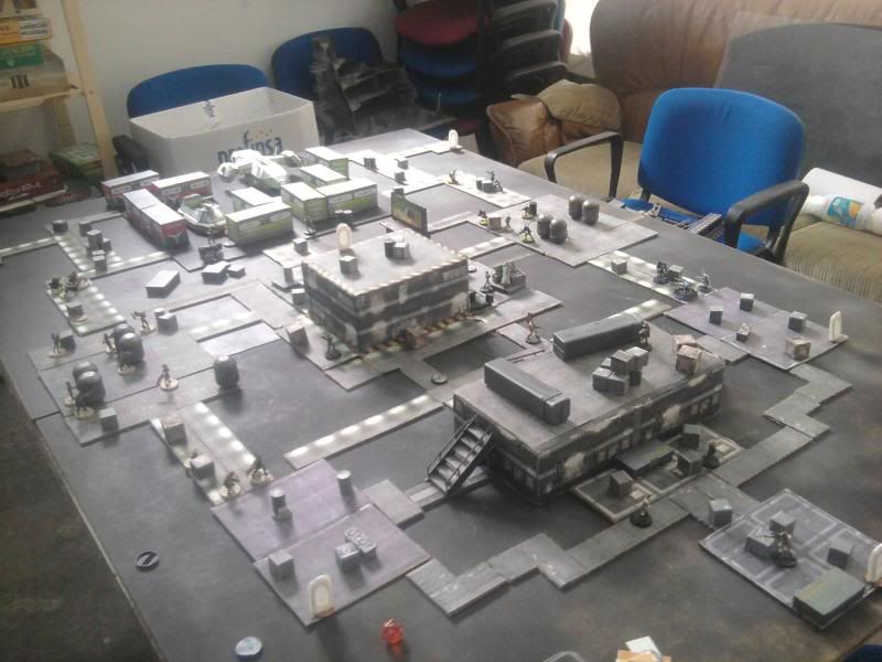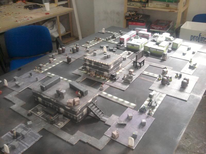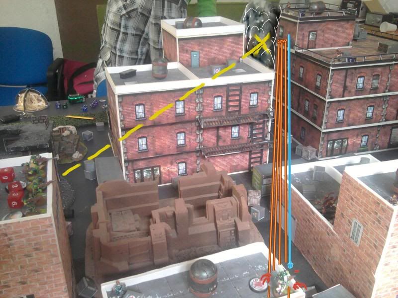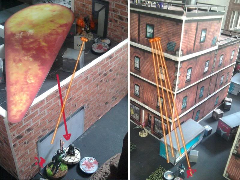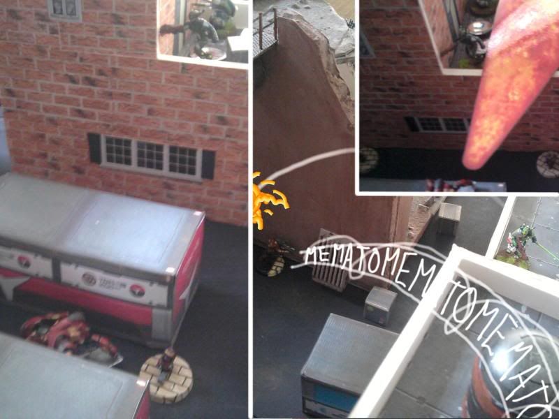 Tenía sobrado de confianza al Guardia de Assalto Tarzán, que con su fiel Cheeta se dirigió a espabilar al morán del centro que podía bloquear al montesa (el moran hace como que está a nivel de suelo, ojo, no os confundáis, nadie está en la terraza). Cuando el humo se disipó, el moran estaba muy muerto y el GdA herido. Tarzán entró en la sala calcinada, y remató al moran. Una vez que todos los nómadas estaban agazapados, entró por el borde de la mesa un confiado Akal (qué pardillo fuí), resultó que el intruder con HMG que estaba en la ventana le vió llegar, y cazó al akal en cuanto entró en acción (los veintipico puntos peor desperdiciados de mi historia). Con la noticia de que el akal había caido, los bagh-maris se atrincheraron en su posición situando fuegos de supresión por doquier. El moran llorón pensaba "con mi estado de ánimo yo no tengo ninguna prisa por acercarme ahí".