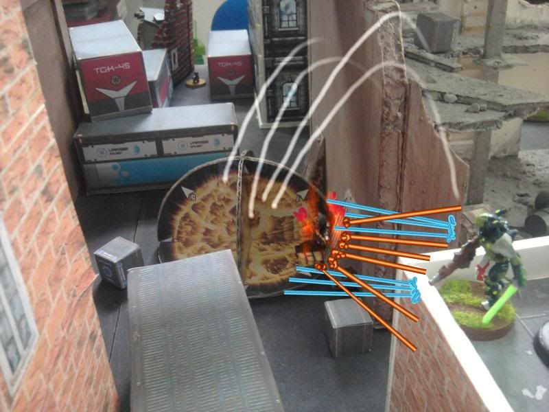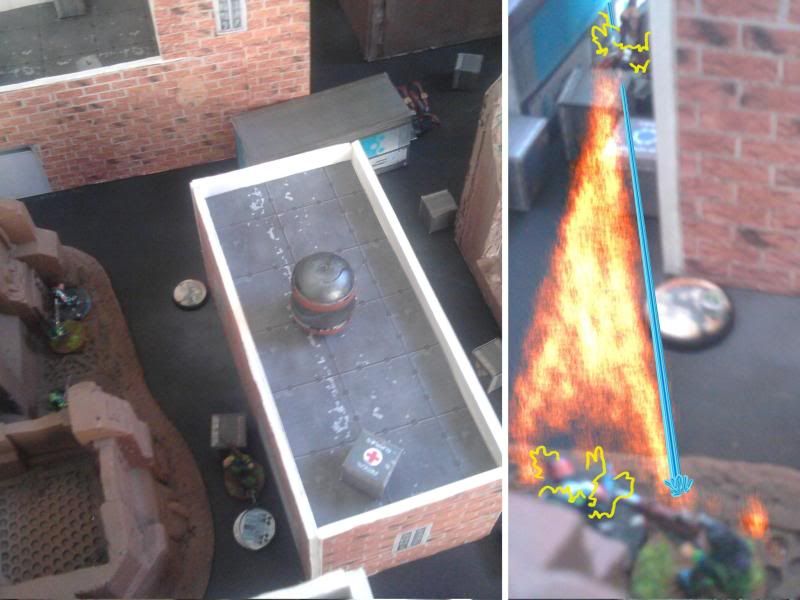 Mientras, el regular francotirador disparó al intruder de la HMG en cuanto el humo se disipó, el intruder se atrevió a responder al fuego enemigo, pero perdió el encuentro y esta vez, la daktari no podría levantarlo. Acto seguido, entró en acción el "Plan D" de ataque de los de Acontecimiento: los regulares abandonaron el edificio en el que estaban cómodamente apostados y salieron a la calle. El francotirador colocó una mina en la esquina a toda prisa (donde pudo llegar, se agotaban las órdenes) y retrocedieron lo más que pudieron para  ponerse a cubierto. La hermosa kate se agazapó junto al palbot medico (ahí delante, al lado de la mina, el cacho peana que asoma).