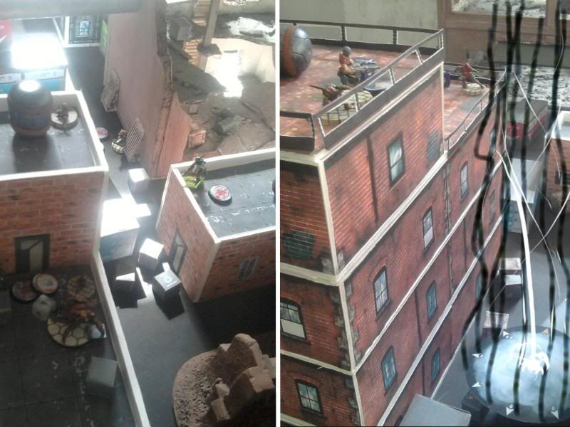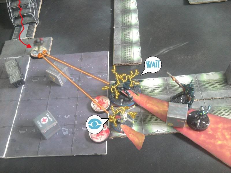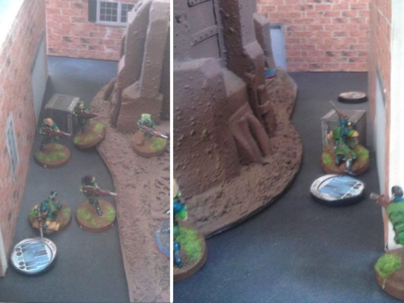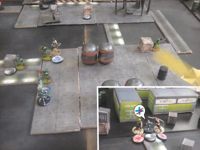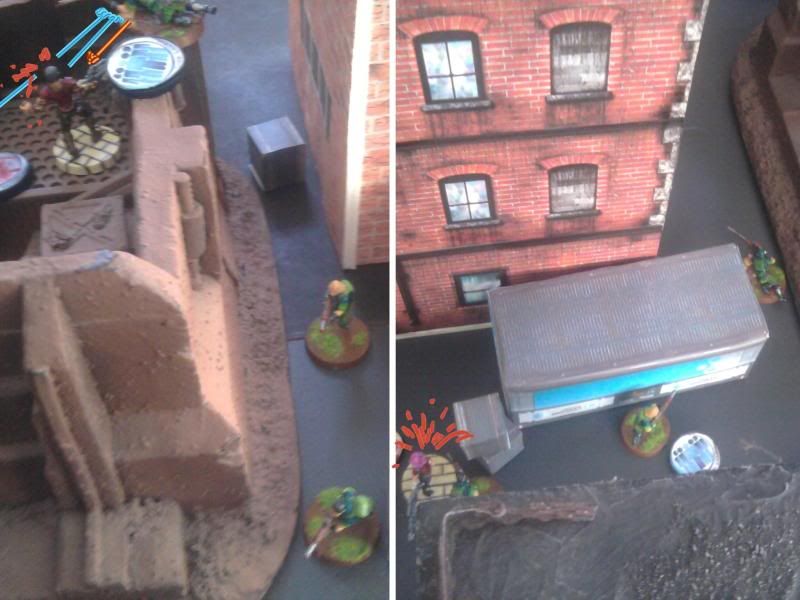 Turno 5 Acontecimiento: El francotirador subió con cuidado las escaleras de la pared, y pacientemente, espero. Se asomó y pudo disparar contra el intruder que se había ocultado pero aún así se veía terriblemente acorralado, ya que los otros regulares le estaban rodeando. Eliminada la amenaza más próxima, los regulares apresaron a la chica de la piruleta (golpe de gracia).
