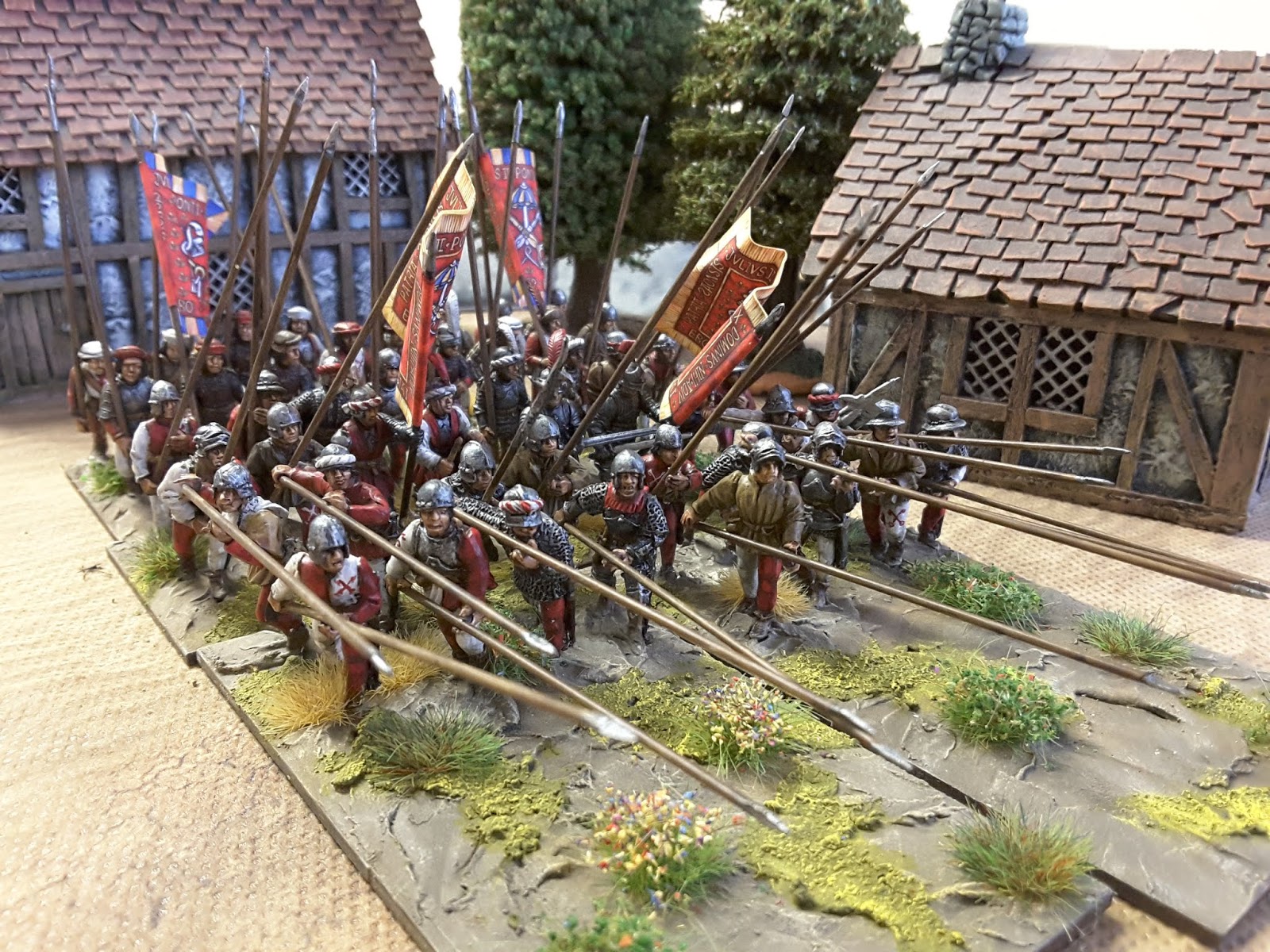 La posición de las picas en estas referencias es correctísima, pero inviable para la mayoría de reglamentos en los que las unidades de choque deben tocar peana con peana.  Para un diorama son magníficas; para un wargame, un dolor de cabeza.