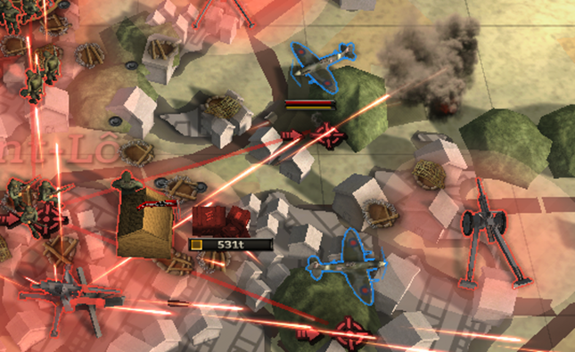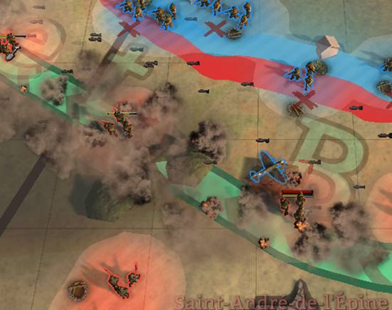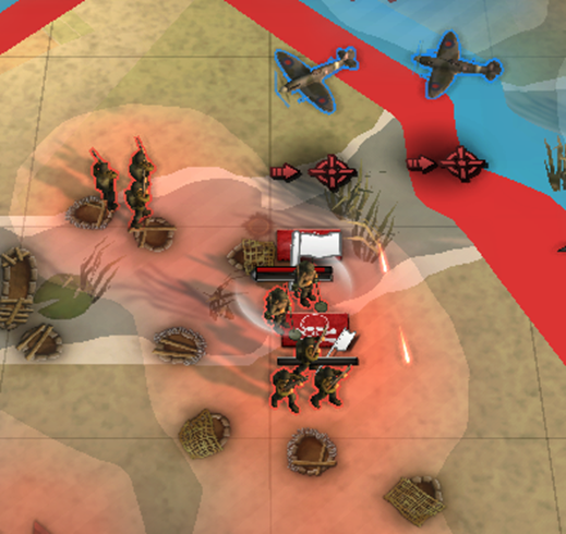 El hecho de que la Luftwaffe sea en gran medida una no-amenaza en este punto de la guerra no significa que tus aviones puedan volverse imprudentes. Las unidades antiaéreas enemigas (flak), como el temido cañón antiaéreo de 88 mm, dispararán a tus aviones que vuelan por encima. El flak inflige daño menor, daño moral pesado y una penalización de estadísticas devastadora. ¡No esperes que los aviones realicen apoyo aéreo cercano o bombardeos de manera muy efectiva mientras están bajo fuego flak! La flak a menudo se posiciona cerca de los cuarteles generales enemigos, así que si tu reconocimiento identifica su Cuartel General, deberías poder evitar el flak.