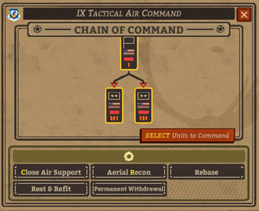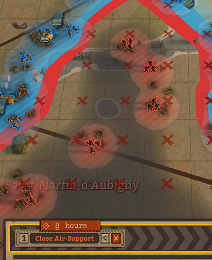 Puedes configurar tu doctrina para que los cazabombarderos patrullen automáticamente y ayuden a las unidades amigas que lo necesiten, o puedes dar órdenes explícitas para atacar enemigos dentro de un área específica durante un tiempo determinado. El apoyo aéreo cercano no es muy efectivo contra enemigos en fortificaciones; son más efectivos contra enemigos a cielo abierto. Úsalos para devastar a las unidades enemigas expuestas y sin fortificar que avanzan hacia tu territorio.