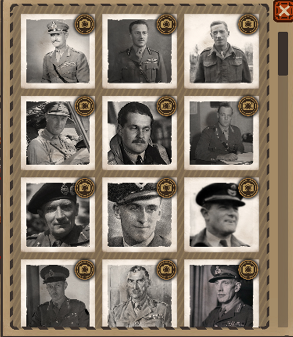 Tras reclutar a un oficial, puedes personalizarlo. Selecciona su retrato entre docenas de oficiales históricos reales y sus antecedentes.