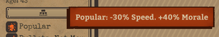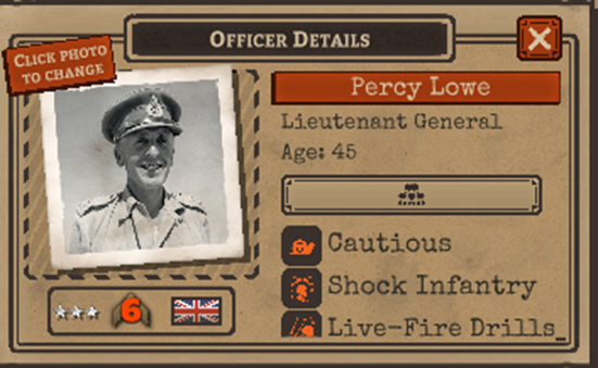 Todos tenemos una personalidad y ciertas peculiaridades, y los oficiales no son la excepción. Cada oficial comienza con una peculiaridad de personalidad aleatoria, que ofrece una bonificación y una penalización de estadísticas. Ejemplo: Tímido: -40% de moral, +10% de defensa. Obtendrán más peculiaridades con el servicio. ¡Elige personalidades de oficial que se ajusten al propósito de esa formación! Ejemplo: Las formaciones blindadas agresivas deben ser lideradas por un oficial con una personalidad agresiva.