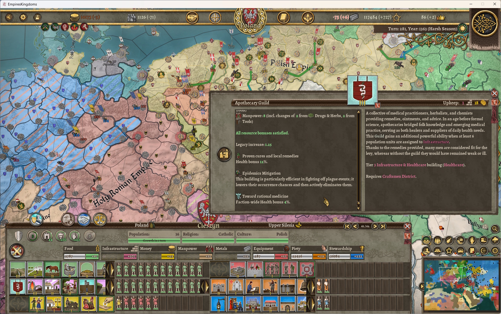El sistema de edificios se amplía en consecuencia, destacando el regreso de las estructuras de Nivel III. Éstas representan especializaciones regionales muy desarrolladas y requieren una inversión previa significativa. Entre ellas, los Gremios (Guilds) juegan un papel central. Cuando cuentan con el apoyo de una población burguesa suficiente, desbloquean poderosas habilidades económicas y reflejan la creciente influencia de las profesiones organizadas en la economía urbana bajomedieval.