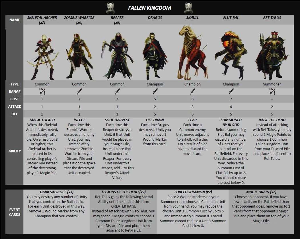 Es un juego de cartas y tiene algunos elementos típicos de juegos tipo Magic, como que las cartas describen unidades, y éstas tienen diferentes habilidades, etc. Sin embargo, se juega sobre un mapa, donde el posicionamiento, distancias etc importan tanto como un juego de miniaturas.