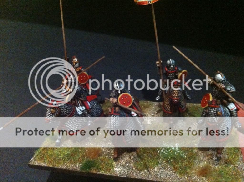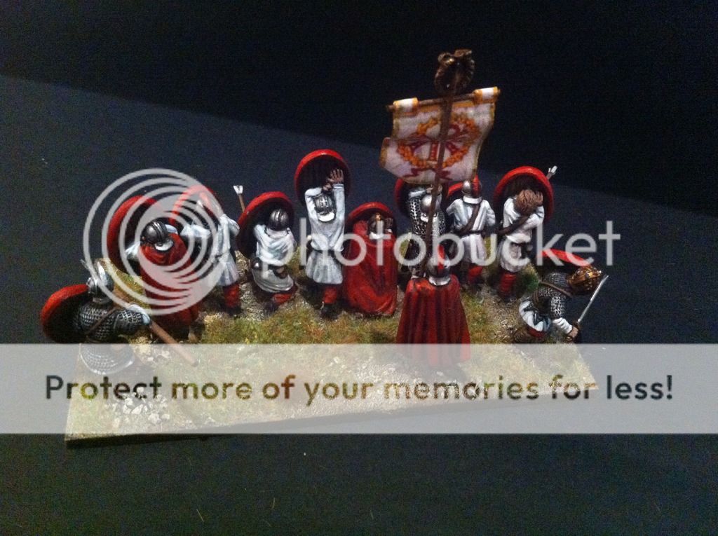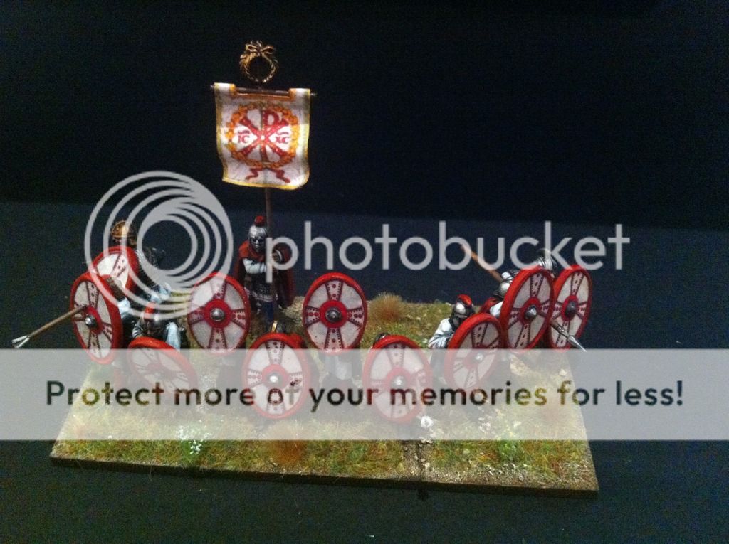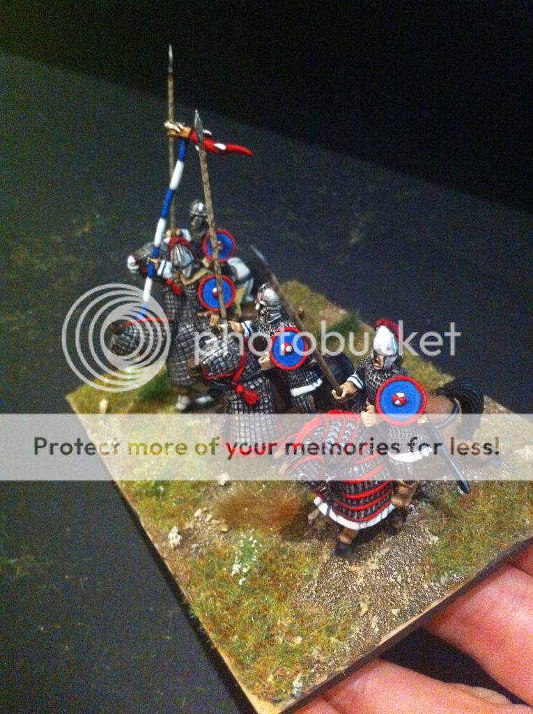 Hola amigos, siguiendo el post de Sasánidas, toca el turno a los Romanos... al menos a parte del ejercito. Las figuras empecé a pintarlas algunas en 2012, así que esas están por debajo del nivel de pintado actual, pero igualmente aceptables :)  He usado como base las figuras de gripping beast, pero tambien unos bizantinos de Belisario de Old Glory que no están tan mal, y conversione los sajones de plastico de gripping en romanos con las cabezas de "west wind" y escudos de resina "clonados" de gripping. Espero que os gusten , ya iré ampliando, porque tengo semiacabados dos unidades de caballería media y mas infantería.
