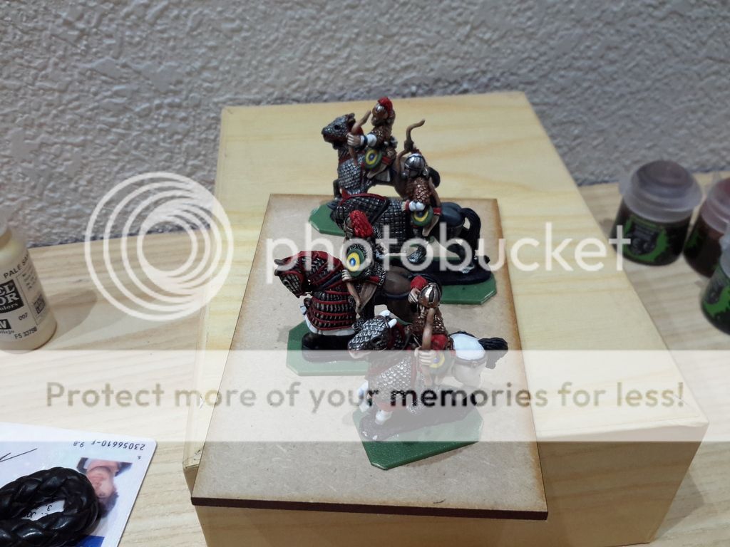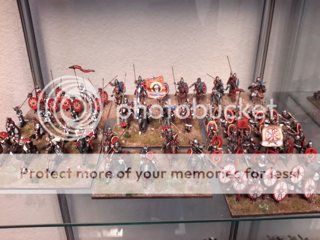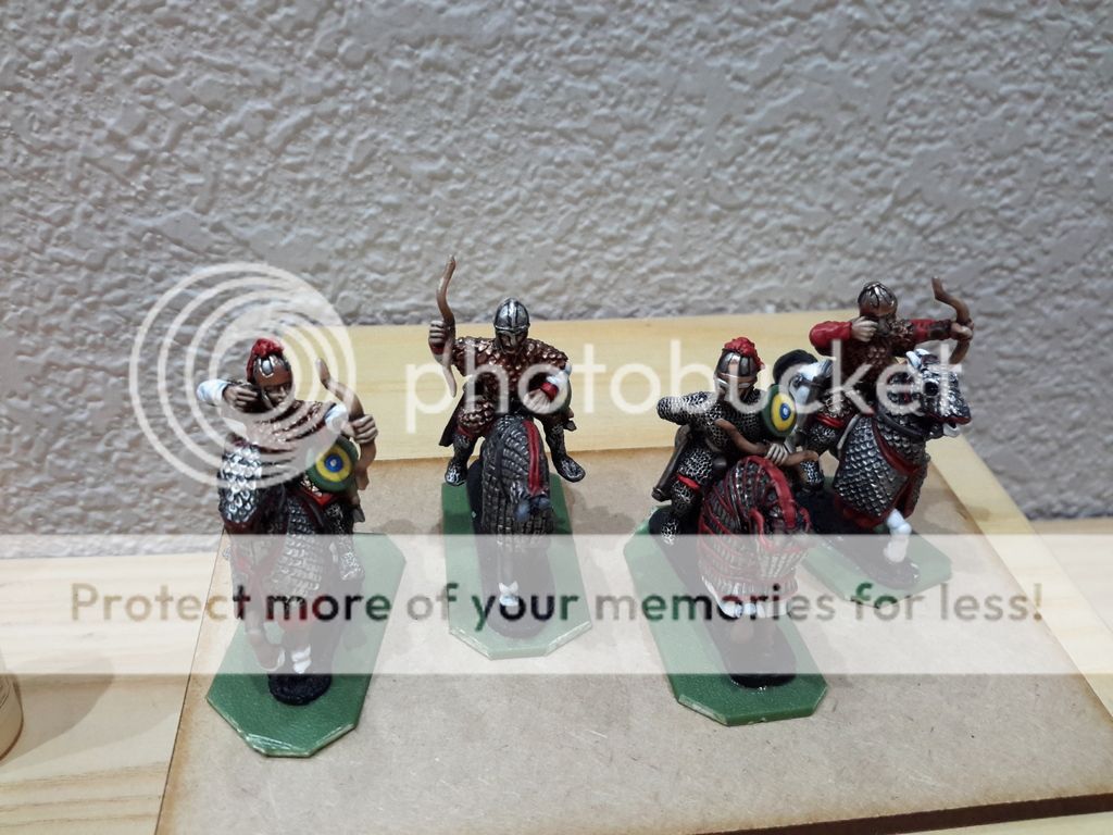 Añado las fotos de la ultima peana, de Sagittarii Catafractarii, una unidad de arqueros a caballo pesados, para usar como romanos tardíos como bizantinos tempranos. Los escudos están pintados basandome en la Notitia Dignitarum,  las figuras son de Foundry, con dos caballos de Old Glory.  la base está sin terminar, y de paso, unas fotos de lo que tengo hasta ahora, sin bien, hay 5 unidades por terminar de basear (pereza maxima ! )