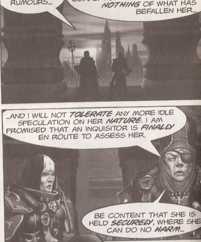 Al fin veis miCanonesa Prioris. Mi proyecto por pura dedicacion a mi Orden de Hermanas, lo que seria la comandante suprema de la Orden. Lo primero que hice fue buscar algo de documentacion de estos oficiales en 40K y ¿sabeis que? No hay absolutamente nada. Miento! si hay algo, en los comics de Warhammer Monthly en los dos primeros capitulos de Daemonifuge aparece una Prioriss asi que escaneo la 2 primeras viñetas donde sale esta y entendereis la fuente de inspiracion