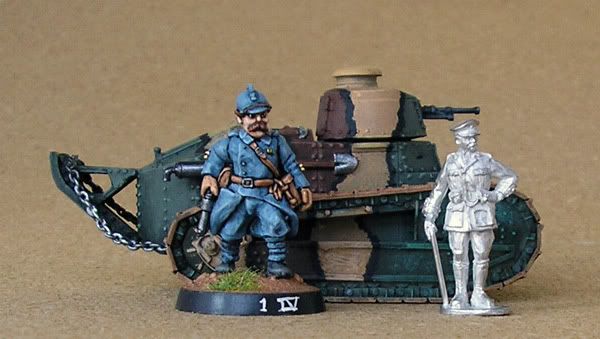 A la izquierda, un oficial de Scarab, más o menos del tamaño de los de Renegade. A la derecha, una miniatura que hizo Richard Ansell para Too Fat Lardies: al ser más pequeño y estilizado, tiene la escala perfecta. La mayoría de fabricantes, como Great War y Brigade Games, están más cerca del primero que del segundo. Aquí tenéis al entrañable Sargento Hartman conduciendo la copia americana del FT-17 para que os hagáis una idea de lo diminuto que es.