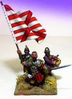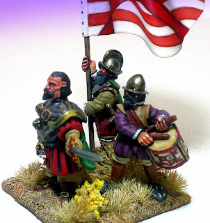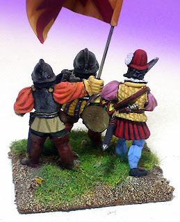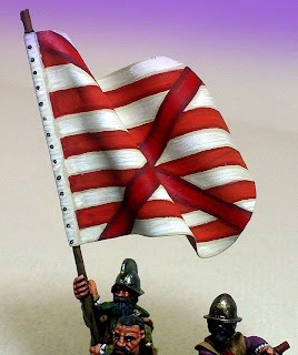 La bandera amarilla con la cruz roja es de lis diseños más comunes de banderas españolas de la época, junto con la de fondo blanco. La de rayas marrones/anaranjadas creo que aparece, si no recuerdo mal, en los tapices de la Conquista de Tunez
