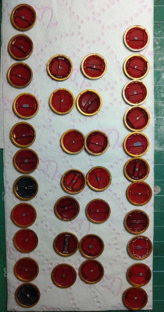Primero los desmontamos de los palillos que hemos usado para manipularlos mejor, y los hacemos una primera presentación de dónde irá cada escudo: (130)