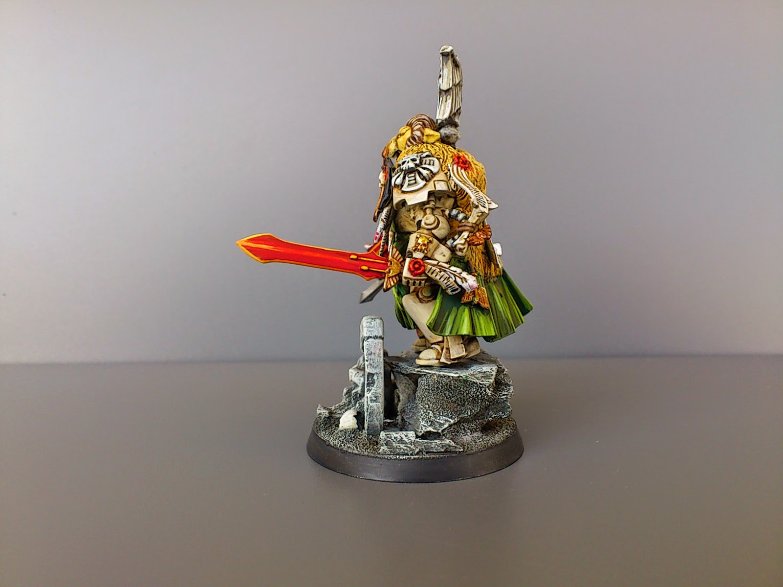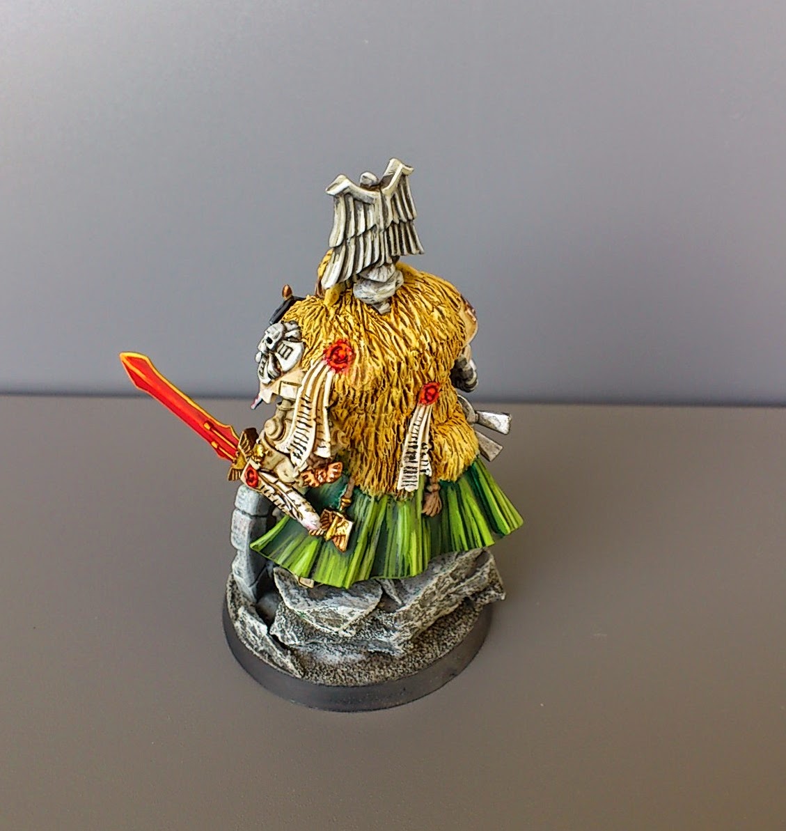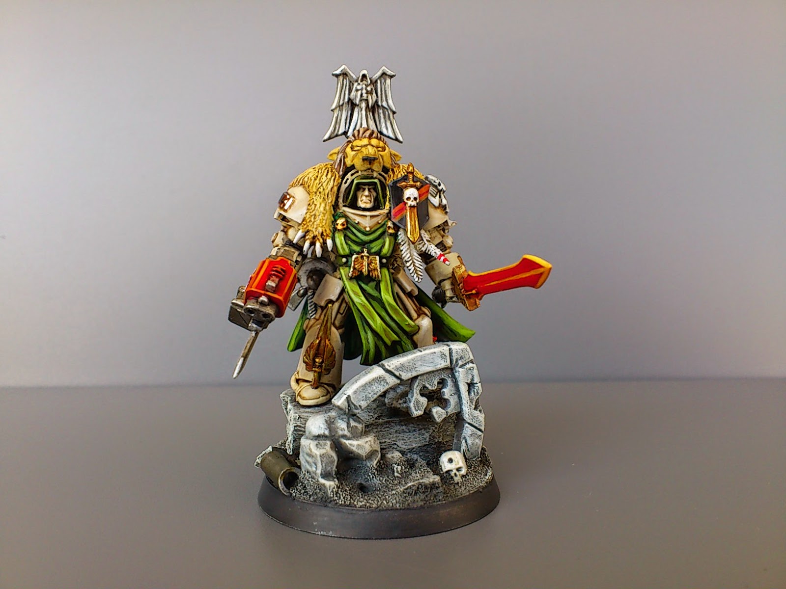 He terminado de pintarla después de mucho tiempo mirándome desde la caja de "pendientes". Las partes que lleva la miniatura son muy variadas. El cuerpo principal es de un exterminador de plástico actual, pero el frontal con el tabardo es de los Templarios Negros con el escudo templario eliminado del cinturón y acoplado un símbolo de capítulo en su lugar. Los brazos son de la matriz de Ángeles Oscuros anterior a las actuales con recolocación de los dos brazos. La capa viene del capitán marine espacial de plástico, y el pellejo de león está hecho de masilla, con la cabeza de león del carro de leones blancos alto elfo. La cabeza es de la matriz del Ala de Cuervo recortada bastante para que encajara en el hueco.
