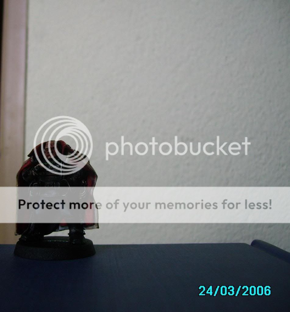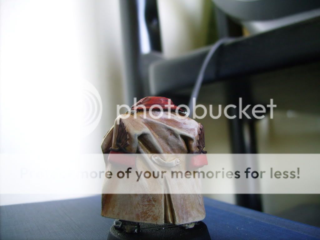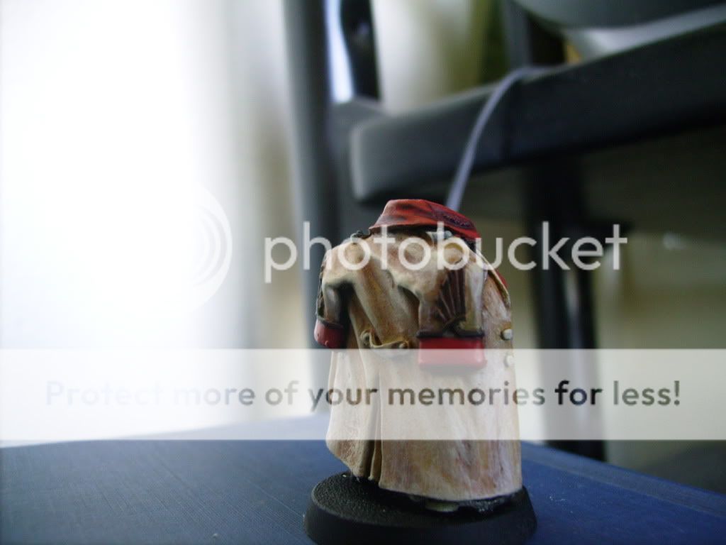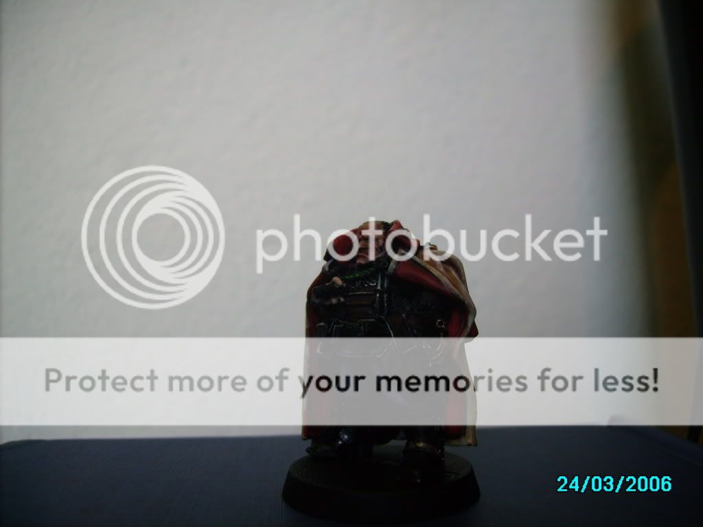 La capa tiene el efecto que le he querido dar. Dheneb Stones, hueso deslucido, tinta sepia y pinceles seco de hueso y de blanco. La armadura y los pantalones como en todas mis tropas, y el rojo interior: Rojo tecnomarine, rojo sangre, tinta negra y rojo.