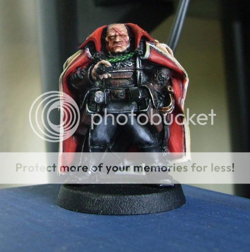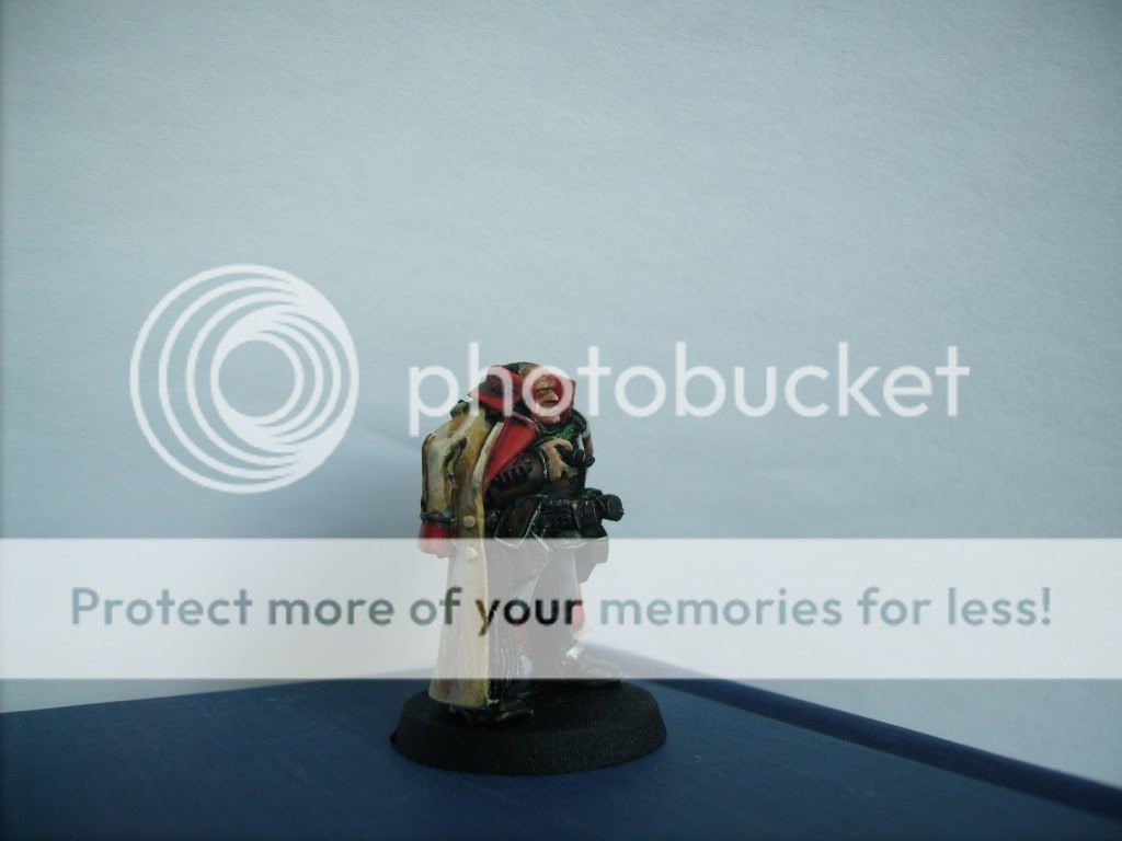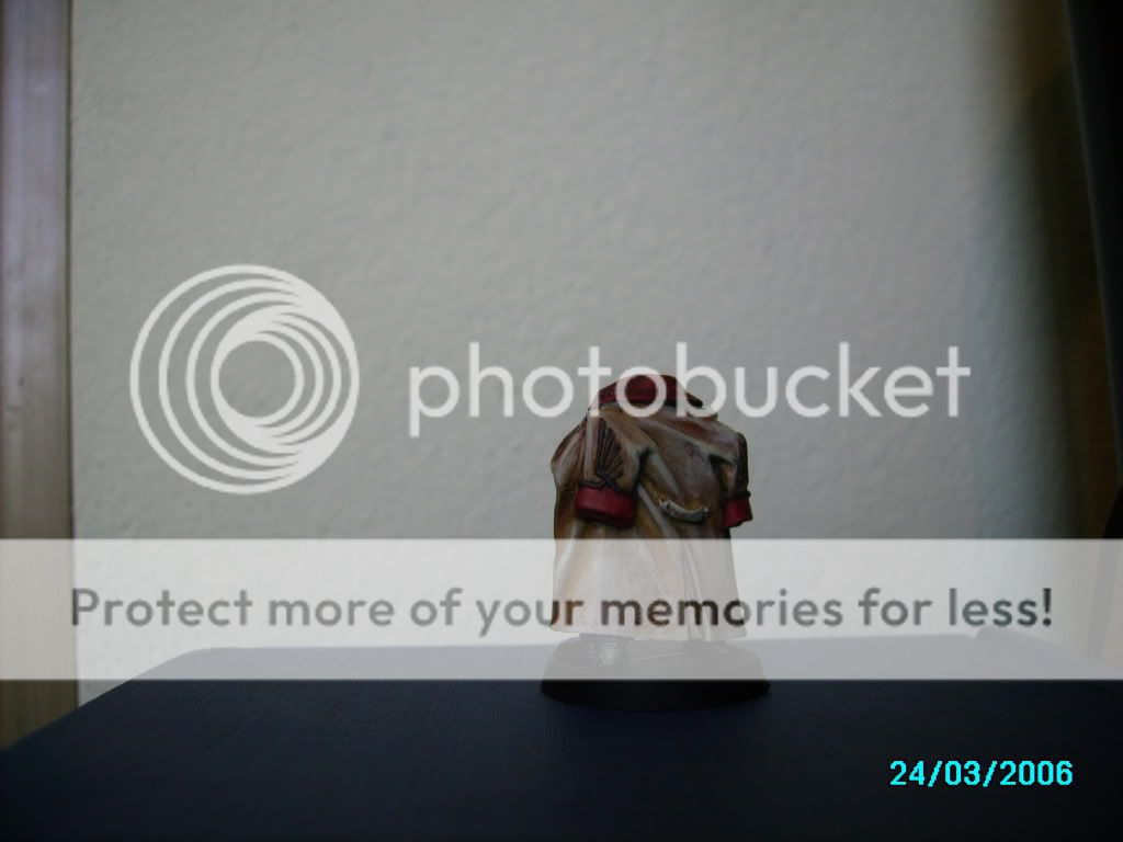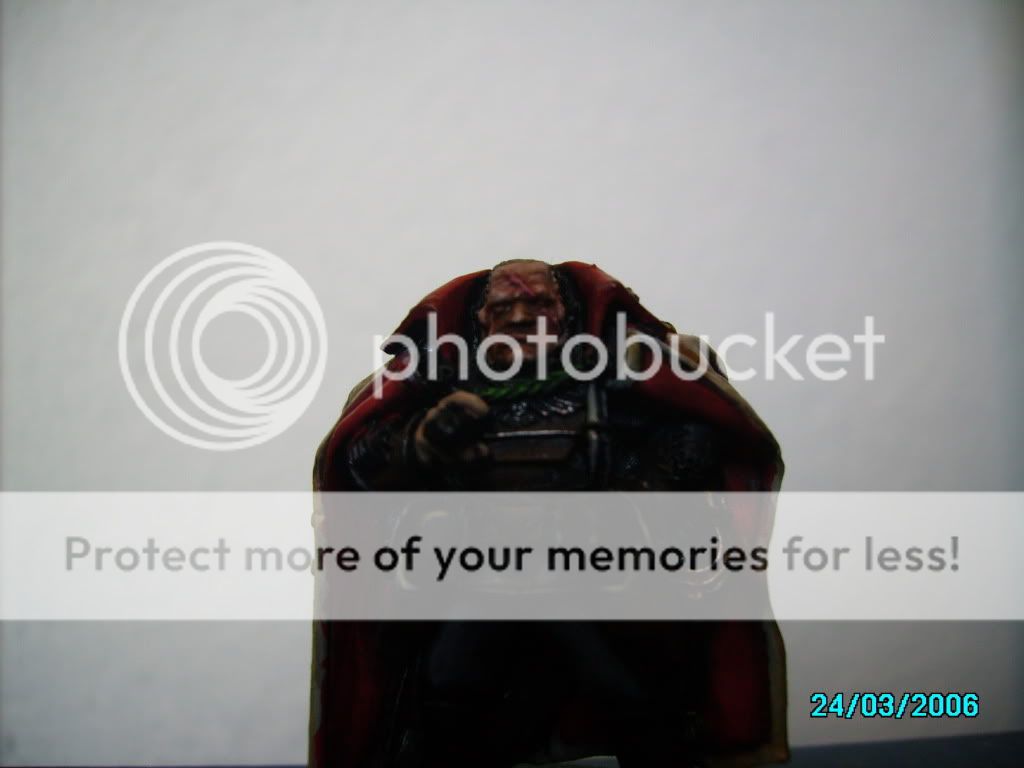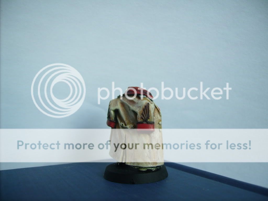 La capa tiene el efecto que le he querido dar. Dheneb Stones, hueso deslucido, tinta sepia y pinceles seco de hueso y de blanco. La armadura y los pantalones como en todas mis tropas, y el rojo interior: Rojo tecnomarine, rojo sangre, tinta negra y rojo.