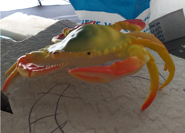 Y probando el tamaño con el cangrejo empezándolo a pintar:
