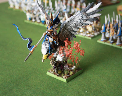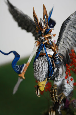 Tras haber encontrado el grifo tenía la mitad de la ecuación, pero ahora me hacía falta la otra mitad, el jinete. No había ningún alto elfo que me gustara y me resistía a usar la miniatura antigua, que es demasiado estática. Por eso, con la salida de Isla de Sangre llegó la respuesta sola, el jinete en grifo.