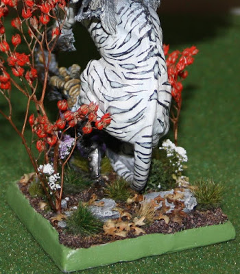 Los grifos, según la mitología, son la unión de un león y un águila (el rey de los animales de tierra y del aire). De hecho la miniatura de Gamezone representa a ambos muy bien. Para que entonara más con el tono general blanco y azul de mi ejército he querido representar un tigre albino en su lugar. Dado que cromáticamente grises y blancos son muy monótonos, finalmente he optado por añadir una peana con mucho color para dar más contraste. Y sin que sirva de precedente, aquí va el resultado pintado.