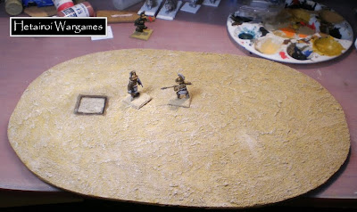 La arena está hecha con una pasta que se llama Vandal. Es como una mezcla de cola blanca y arena. Podría usar eso, cola blanca y arena, pero como las bases de los gladiadores llevan la pasta... pues eso, por unificar.