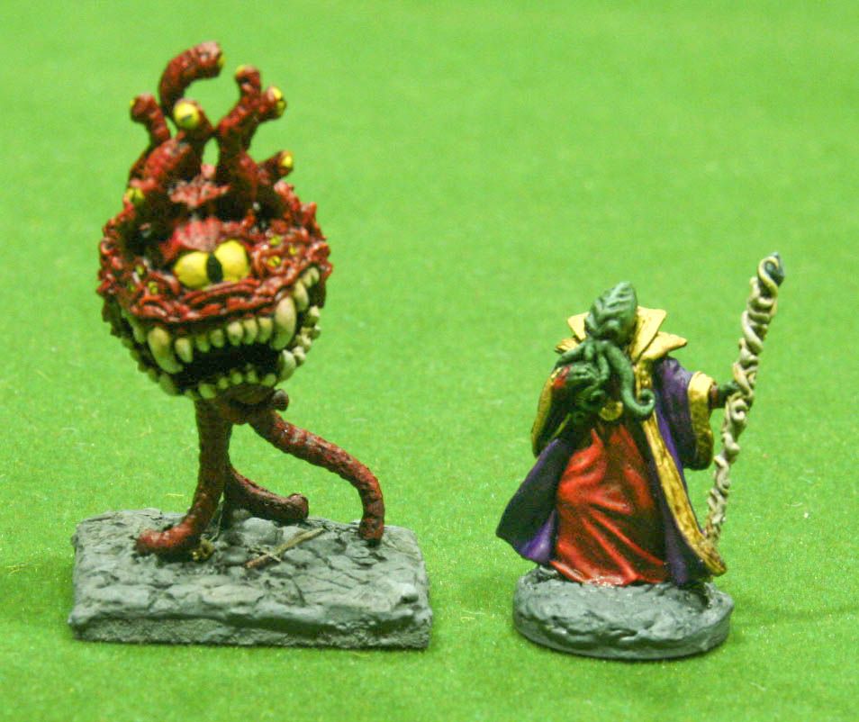 Al Illithiano le dí un tono verdoso para que estuviera en consonancia con Cthulhu, ya que es muy posible que lo use como sacerdote del Culto de Dagon en el futuro. El Beholder rojo es un clásico del D&D y ambos juntos una pesadilla para los jugadores  :bat